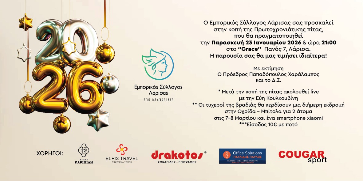 Ο Εμπορικός Σύλλογος Λάρισας διοργανώνει την κοπή της Πρωτοχρονιάτικης πίτας του, που θα πραγματοποιηθεί αύριο Παρασκευή 23 Ιανουαρίου 2026 και ώρα 21:00 στο Grace, Πανός 7 στη Λάρισα.