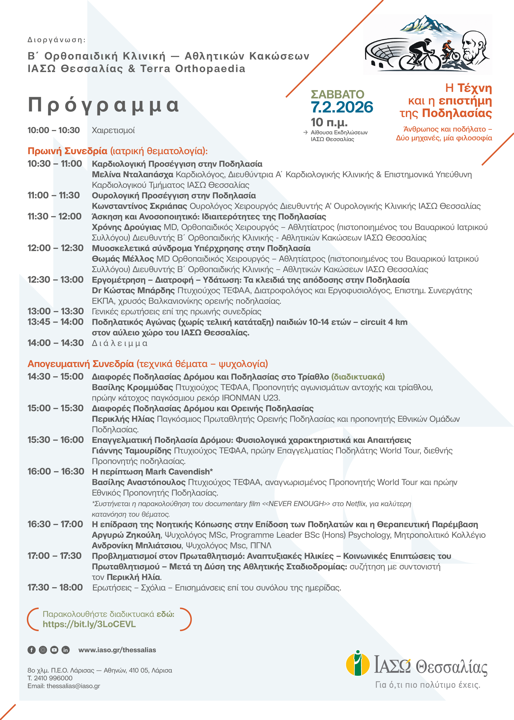 Η Β΄ Ορθοπαιδική Κλινική – Αθλητικών Κακώσεων του ΙΑΣΩ Θεσσαλίας διοργανώνει το Σάββατο 7 Φεβρουαρίου 2026 την επιστημονική ημερίδα «Άνθρωπος και ποδήλατο – Δύο μηχανές, μία φιλοσοφία», αφιερωμένη στην αγωνιστική ποδηλασία.