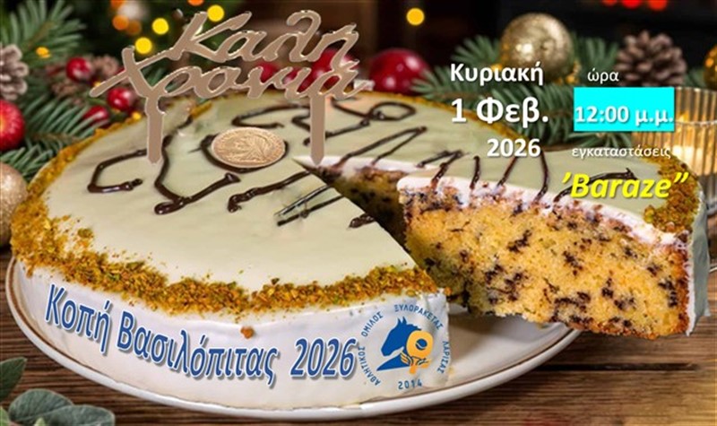 O αθλητικός σύλλογος ΑΟΞ Λάρισας πραγματοποιεί κοπή Βασιλόπιτας την Κυριακή 1 Φεβρουαρίου 2026, και ώρα 12:00, στις αθλητικές εγκαταστάσεις του ‘’Baraze’’, που βρίσκονται στο 2ο χιλ. Λάρισας – Θεσσαλονίκης.