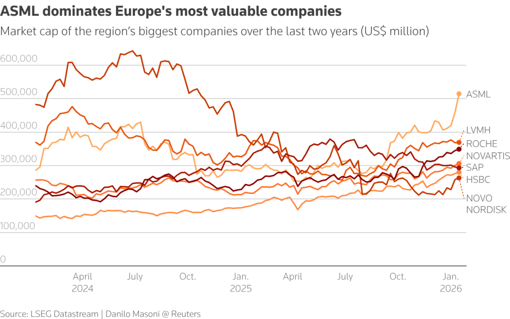 Η ζήτηση για τα υψηλής τεχνολογίας εργαλεία της ASML έχει καταστήσει την εταιρεία την πιο πολύτιμη εισηγμένη εταιρεία της Ευρώπης, με κεφαλαιοποίηση που πρόσφατα ξεπέρασε τα 500 δισεκατομμύρια δολάρια.