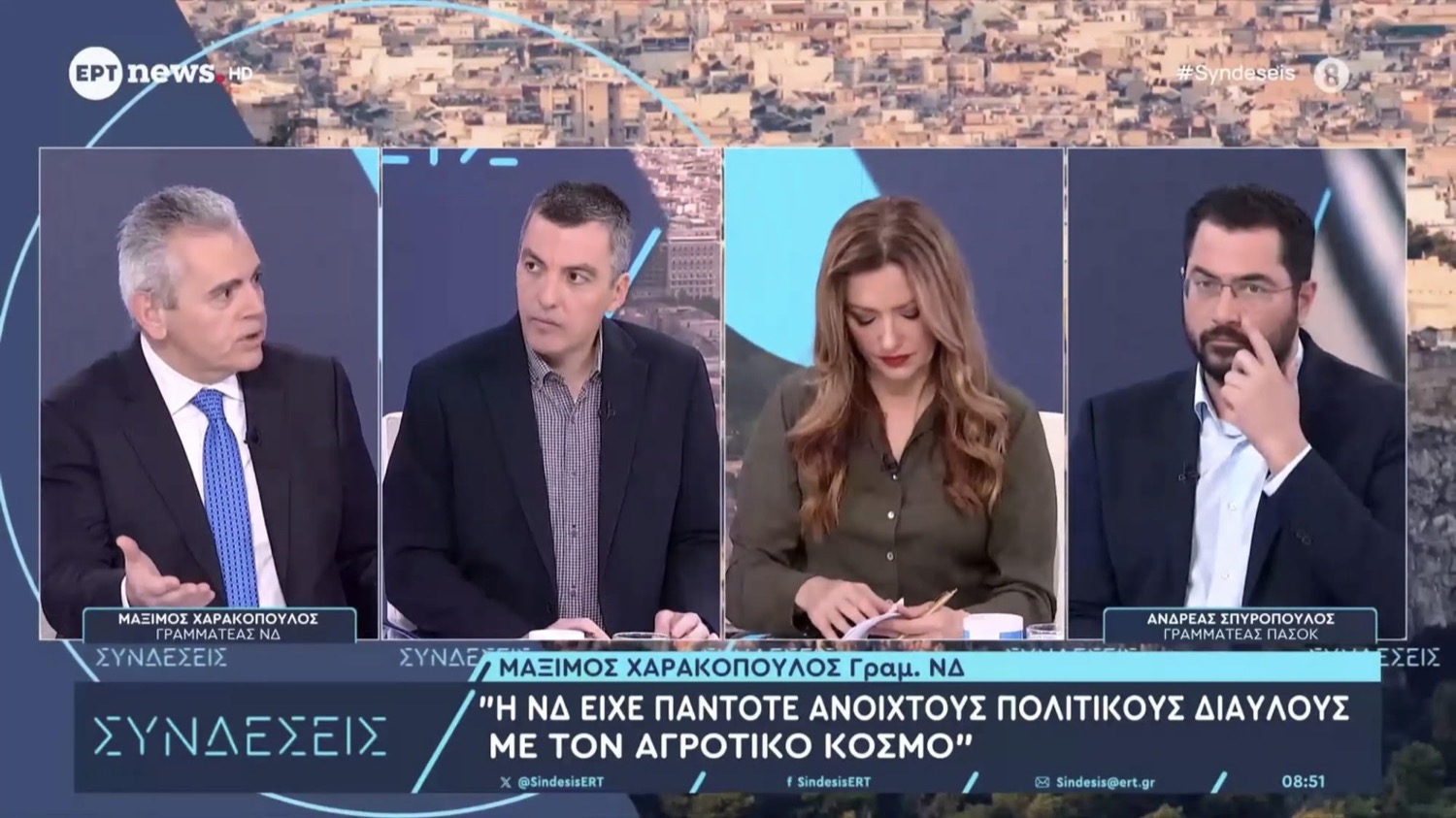 «Η ΝΔ είχε πάντοτε ανοιχτούς διαύλους επικοινωνίας με τον αγροτικό κόσμο και πολλοί εξ αυτών που συμμετείχαν σε αγροτικές κινητοποιήσεις προέρχονται από το χώρο το δικό μας. Είναι, θα έλεγα, συνομιλητές μας. Εξέφρασαν μια αγωνία η οποία εισακούστηκε από την κυβέρνηση». Τα παραπάνω τόνισε ο Γενικός Γραμματέας της Κοινοβουλευτικής Ομάδας της Νέας Δημοκρατίας, βουλευτής Λαρίσης, κ. Μάξιμος Χαρακόπουλος μιλώντας στην ΕΡΤnews και την εκπομπή ΣΥΝΔΕΣΕΙΣ με τους δημοσιογράφους κ. Κώστα Παπαχλιμίντζο και κ. Κατερίνα Δούκα, σε μια συζήτηση στην οποία συμμετείχε και ο Γραμματέας του ΠΑΣΟΚ κ. Ανδρέας Σπυρόπουλος.