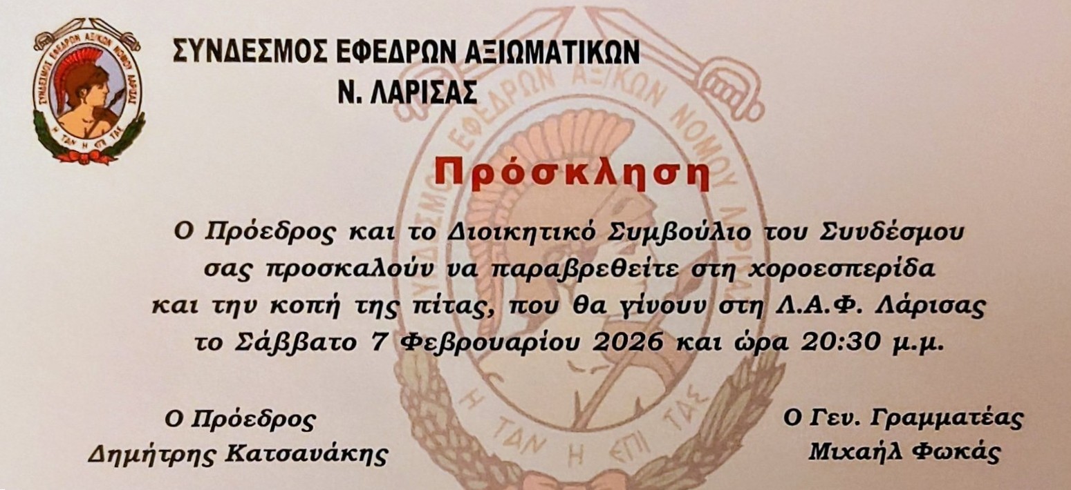 Την πρωτοχρονιάτικη βασιλόπιτα του θα κόψει το Σάββατο 7 Φεβρουαρίου 2026 και ώρα 20:30 ο Σύνδεσμος Εφέδρων Αξιωματικών Λάρισας στη Λέσχη Αξιωματικών Φρουράς (Κύπρου & Φιλελλήνων).