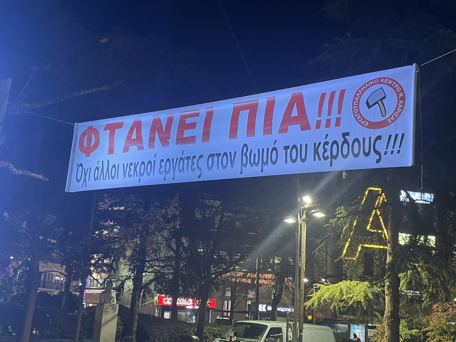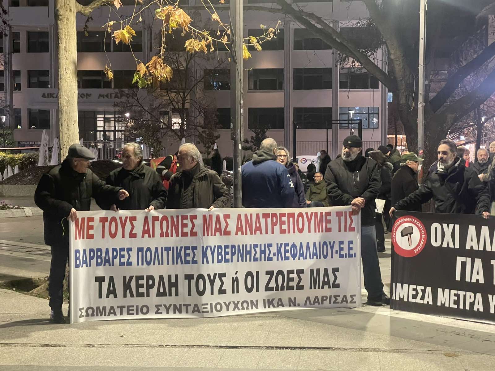 Με πρωτοβουλία του Εργατικού Κέντρου Λάρισας αλλά και με τη συμμετοχή και άλλων φορέων και οργανώσεων όπως το Σωματείο Συνταξιούχων ΙΚΑ Λάρισας, ο Σύλλογος Εκπαιδευτικών Π.Ε. Λάρισας “Κων/νος Κούμας”,το Σωματείο Εργαζομένων στην Ιδιωτική Υγεία καθώς και το παράρτημα Λάρισας του Ρουβίκωνα.