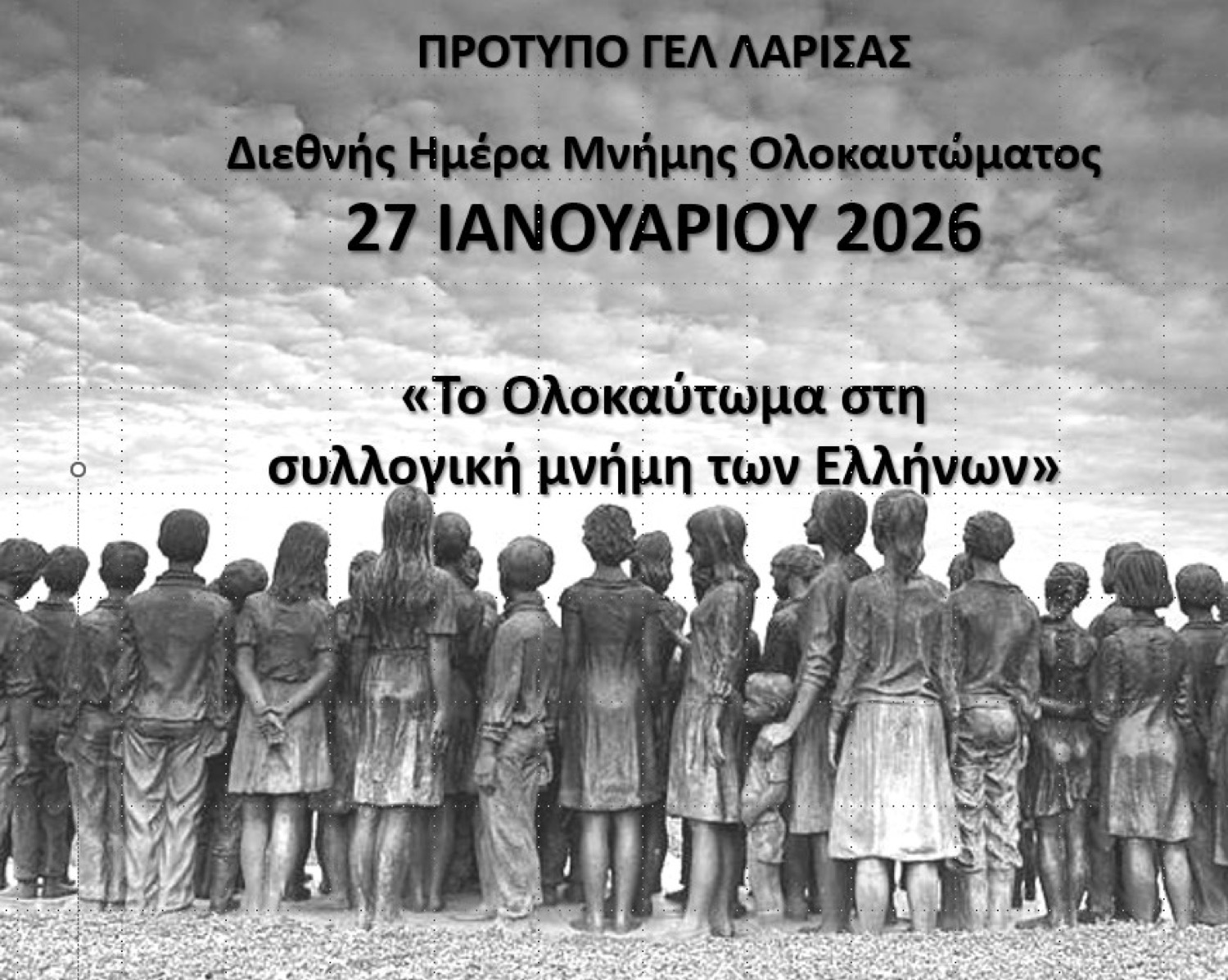 * Το Πρότυπο ΓΕΛ συμμετέχει και στη σημερινή (29.01.2026) αφιερωματική εκδήλωση με θέμα «Η Μνήμη ως Διδαχή» που διοργανώνει η Δ/νση Β/θμιας Εκπ/σης στην αίθουσα του Δ.Ω.Λ. (10 π.μ.), με την απαγγελία του ποιήματος του Wystan Huge Auden «Προσφυγικό Μπλούζ» από τις μαθήτριες Μαλαματή Μίζιου και Χαρούλα Μπαντή, υπό την μουσική υπόκρουση τσέλου από τον Μάριο Μανδυλά και την παρουσίαση του μικρού θεατρικού έργου «O Θεός στο Άουσβιτς» από τους μαθητές Βασιλική Μπριάστικα, Ιωάννη Παπαχρήστο, Βασίλειο Καπετάνο, Μυρτώ Μήτσου και Μιχαήλ Μουλά. Επίσης, με τη συμμετοχή στην Έκθεση ζωγραφικών έργων με τη ζωγραφιά «Ένας αριθμός…», της μαθήτριας Αγάπης Νιδέλκου. Υπεύθυνος ο φιλόλογος κ. Ευάγγελος Σακκάς.