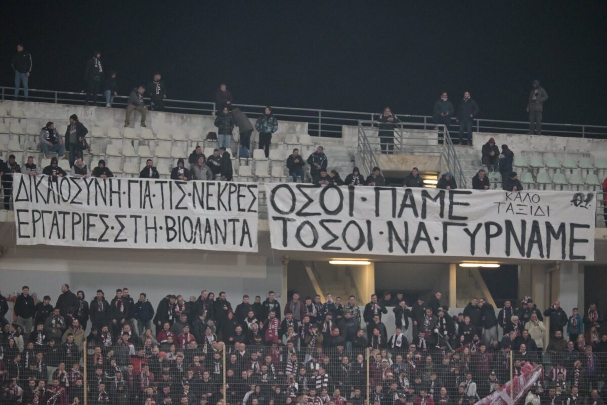 Φίλαθλοι της ΑΕΛ ύψωσαν πανό στο Πανθεσσαλικό για τις τραγωδίες στη Ρουμανία και το εργοστάσιο «Βιολάντα» (φωτό)