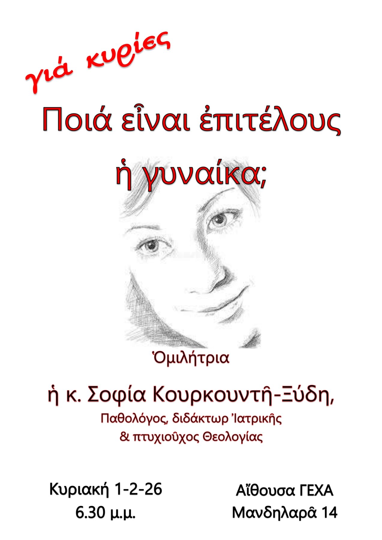 Αύριο την Κυριακή 1-2-2026, παραμονή της εορτής της Υπαπαντής του Κυρίου, και στις 6:30μ.μ. η κ. Σοφία Κουρκουντή-Ξύδη, παθολόγος, διδάκτωρ Ιατρικής και πτυχιούχος Θεολογίας, θα μιλήσει σε κυρίες στην αίθουσα της ΓΕΧΑ (Μανδηλαρά 14) με θέμα: Ποια είναι επιτέλους η γυναίκα;