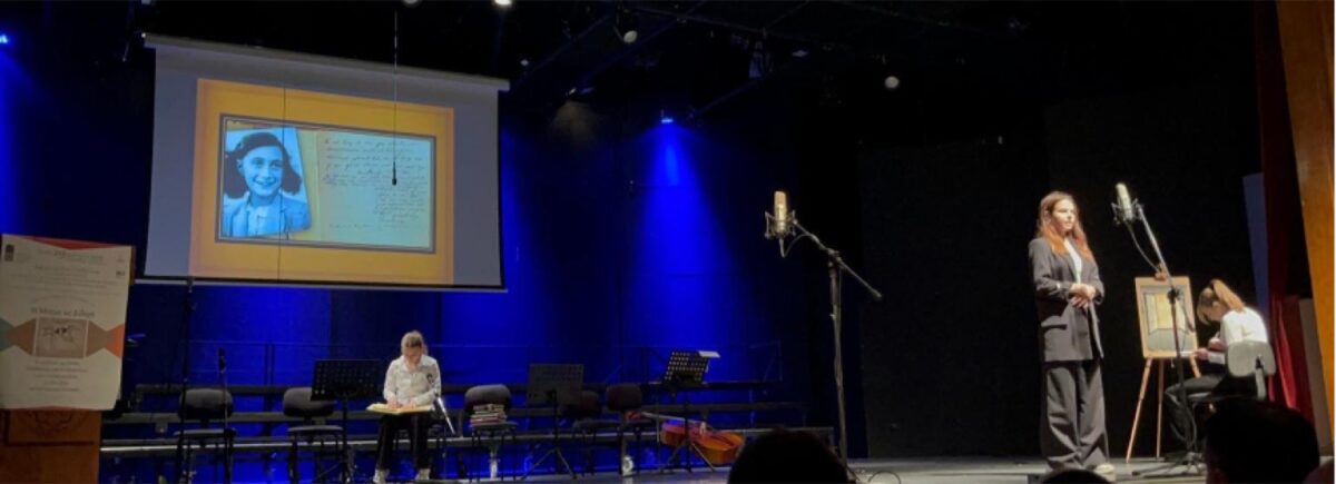 Η μαθητική συμμετοχή μας περιελάμβανε τη δημιουργική απόδοση σε θεατρικό δρώμενο ενός αποσπάσματος από το Ημερολόγιο της Άννας Φρανκ (Παρασκευή, 21 Ιουλίου 1944). Πρόκειται για ένα κείμενο βαθιά ανθρώπινο και ταυτόχρονα πολιτικό, στο οποίο η νεαρή Άννα καταγράφει με οξυδέρκεια, ειρωνεία και ελπίδα τις εξελίξεις του πολέμου, λίγες μόλις ημέρες πριν από τη σύλληψή της. Το απόσπασμα αυτό, αποτυπώνει με μοναδική διαύγεια τη σκέψη, την αγωνία και την ελπίδα μιας έφηβης μέσα στη δίνη της ναζιστικής θηριωδίας, αναδεικνύοντας όχι μόνο τη φρίκη του πολέμου, αλλά και τη βαθιά ανθρώπινη ανάγκη για ελευθερία, ειρήνη και αξιοπρέπεια.