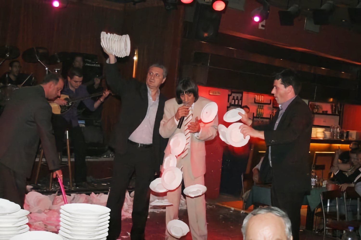 Υπήρχαν κανόνες, ιεροτελεστία. Ζητούσες μια ντουζίνα πιάτα, τα οποία το γκαρσόν είτε τα έσπαγε στη πίστα μπροστά στην τραγουδίστρια, είτε να τα άφηνε στο τραπέζι να τα σπάσει ο πελάτης. Το σπάσιμο γινόταν με ιδιαίτερη τέχνη. Το γκαρσόν, γονατισμένο στο ένα πόδι, κρατούσε στο δεξί ένα πιάτο, με το οποίο σφυρηλατούσε τα υπόλοιπα που έχει στοιβαγμένα και τα κρατούσε στο αριστερό. Άλλες φορές ο μετρ κρατούσε σφυράκι και τα έσπαζε· αυτό που το έμενε τελευταίο στο δεξί χέρι το πέταγε στην πίστα. Άλλες, πιο θεαματικές, τα πιάτα στοιβάζονται στη σκηνή, δημιουργώντας δύο ή και περισσότερες στοίβες ψηλές, στην κορυφή έβαζαν ένα ποτήρι με ποτό, τα πιάτα όλα καταβρέχονται με οινόπνευμα, το γκαρσόν τα άναβε και τα έκανε πρώτα φλαμπέ πριν τα σπάσει με το σφυράκι του ανεβασμένος σε καρέκλα ή σε σκάλα ανάλογα με το ύψος της στοίβας.