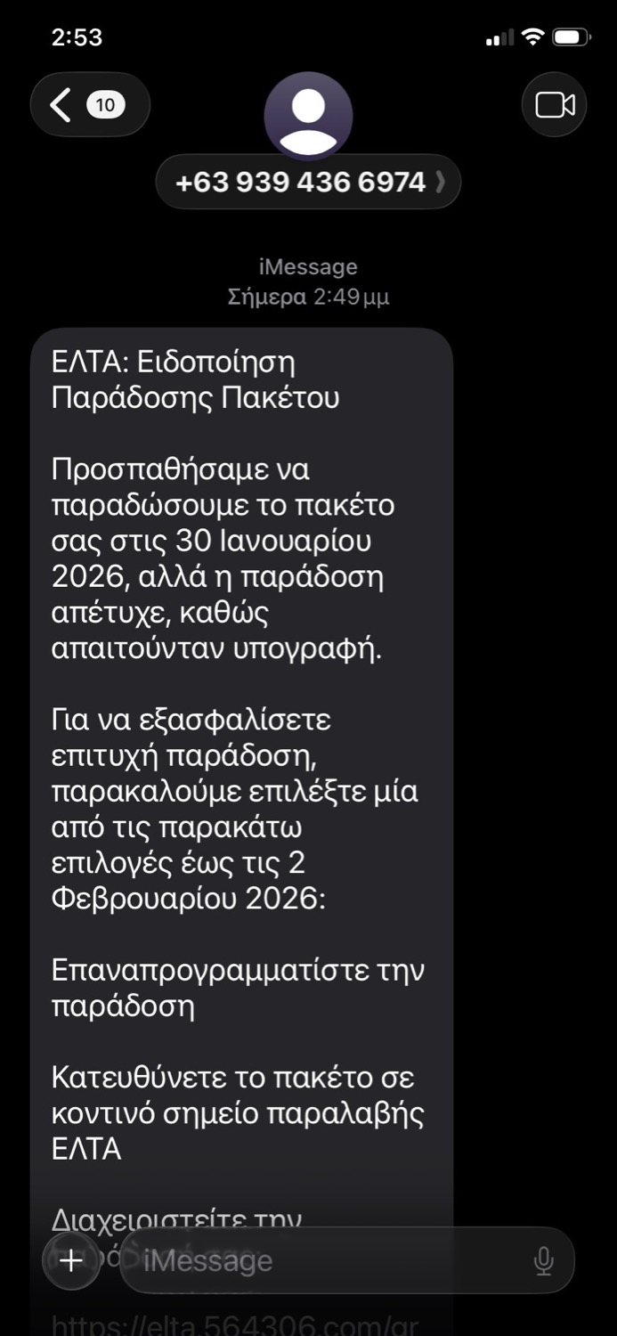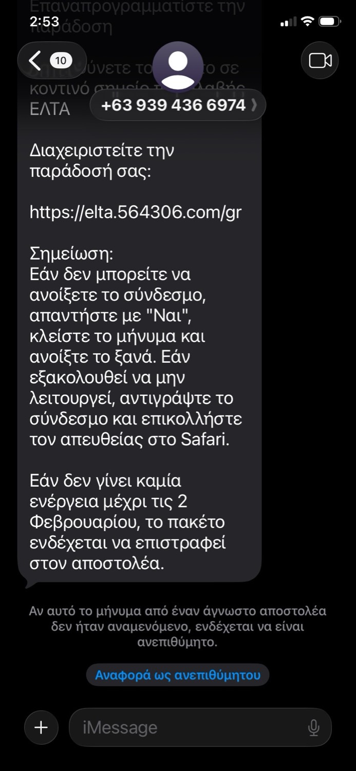 Στην πρώτη ματιά, όλα έμοιαζαν πειστικά, καθώς υπήρχε αναφορά σε συγκεκριμένη ημερομηνία, προθεσμία για ενέργεια, ακόμα και απειλή ότι το δέμα θα επιστραφεί στον αποστολέα αν δεν υπάρξει ανταπόκριση. Ωστόσο, μια πιο προσεκτική ματιά αποκαλύπτει ξεκάθαρα σημάδια απάτης. Ο αποστολέας ήταν άγνωστος αριθμός εξωτερικού, συγκεκριμένα με κωδικό +63 (Φιλιππίνες), ενώ ο σύνδεσμος που παρατίθεται δεν έχει καμία σχέση με την επίσημη ιστοσελίδα των ΕΛΤΑ, παρά μόνο χρησιμοποιεί το όνομα για να παραπλανήσει.