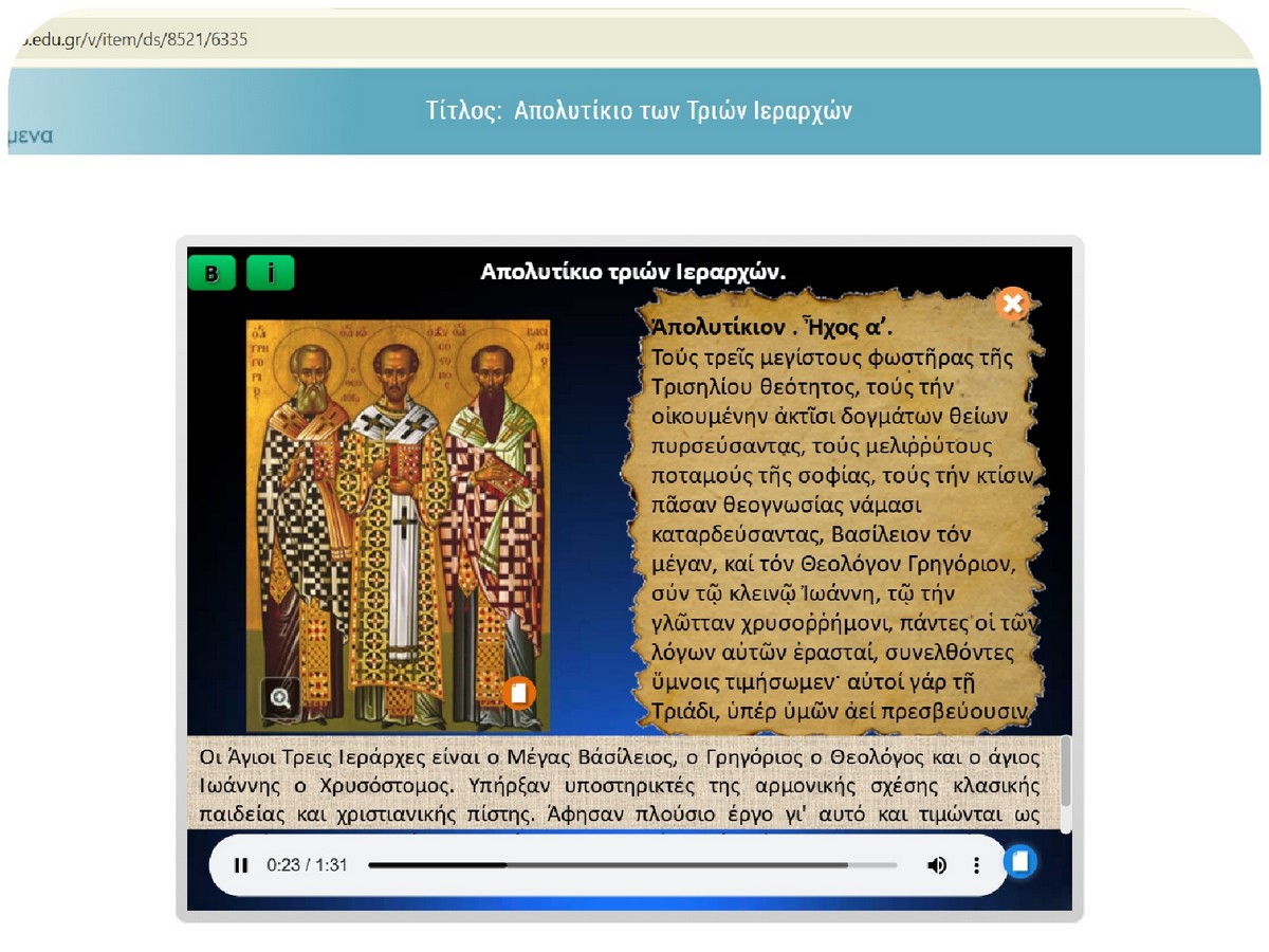 Κατά τη διάρκεια της σχολικής εκδήλωσης που συντόνισε η φιλόλογος του σχολείου κ. Βούλγαρη Αγορίτσα, οι μαθητές/-τριες παρακολούθησαν σχετικό βίντεο, το οποίο παρουσίαζε τη ζωή και το πνευματικό έργο των Τριών Ιεραρχών με τρόπο κατανοητό και ενδιαφέρον. Ακολούθησε διαδραστικό κουίζ, στο οποίο συμμετείχαν με ενθουσιασμό, ελέγχοντας τις γνώσεις τους και ενισχύοντας τη μαθησιακή εμπειρία. Κατόπιν, διαβάστηκε και ακούστηκε το απολυτίκιο των Τριών Ιεραρχών, δημιουργώντας κλίμα σεβασμού και περισυλλογής.