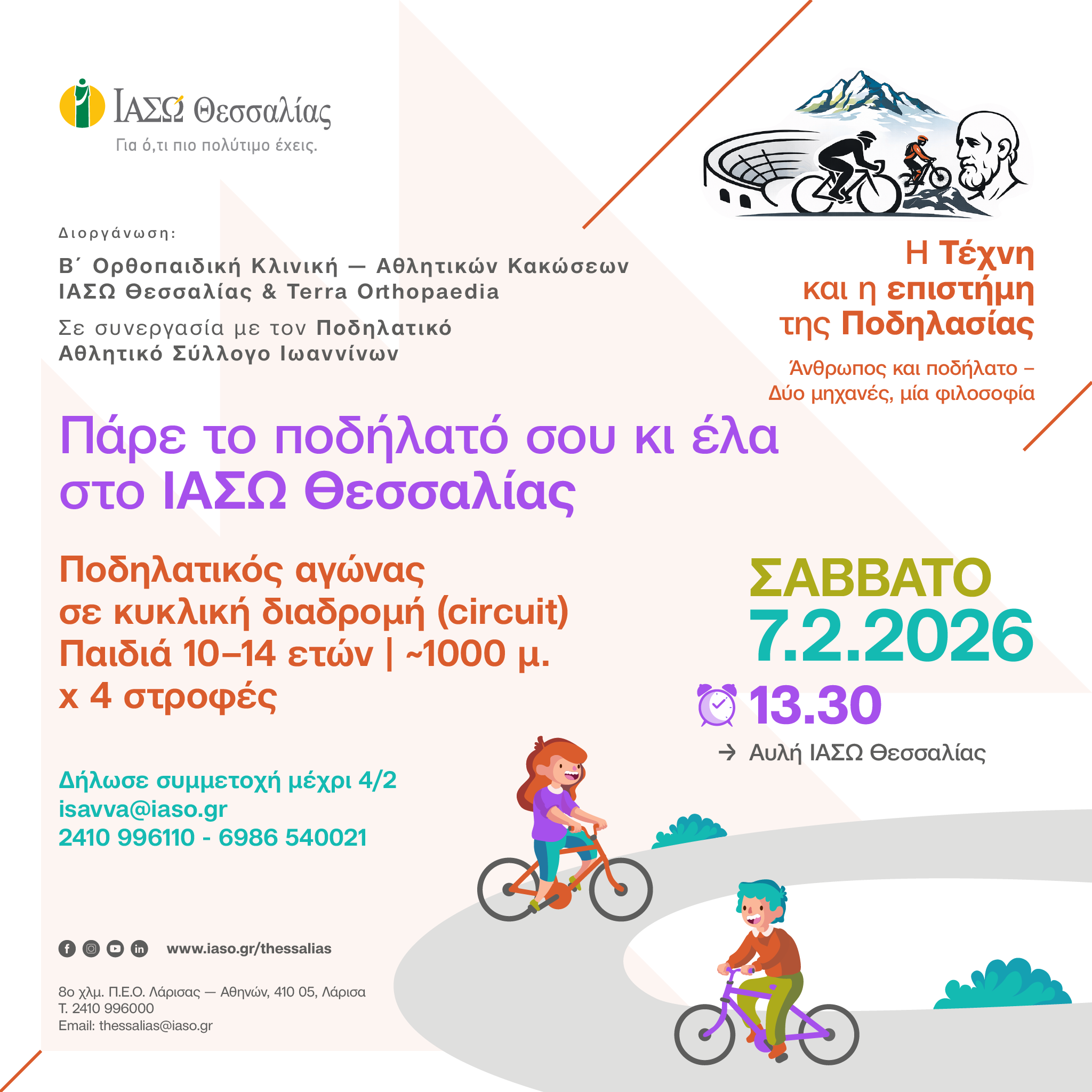 Στο πλαίσιο της εκδήλωσης θα πραγματοποιηθεί και ποδηλατικός αγώνας παιδιών ηλικίας 10–14 ετών, σε συνεργασία με τον Ποδηλατικό Αθλητικό Σύλλογο Ιωαννίνων, σε κυκλική διαδρομή στον αύλειο χώρο του ΙΑΣΩ Θεσσαλίας. Ο αγώνας έχει εκπαιδευτικό χαρακτήρα και διεξάγεται χωρίς τελική κατάταξη, με έμφαση στη σωστή αθλητική παιδεία, την ασφάλεια και τη χαρά της συμμετοχής. Για τη συμμετοχή, είναι απαραίτητη η γονική συγκατάθεση, ή ιατρική βεβαίωση, ή επικυρωμένο αθλητικό δελτίο. Ώρα προσέλευσης 13:00, Εκκίνηση 13:45. Δηλώσεις συμμετοχής: Ιωάννα Σάββα τηλ. 6986540021 email: isavva@iaso.gr