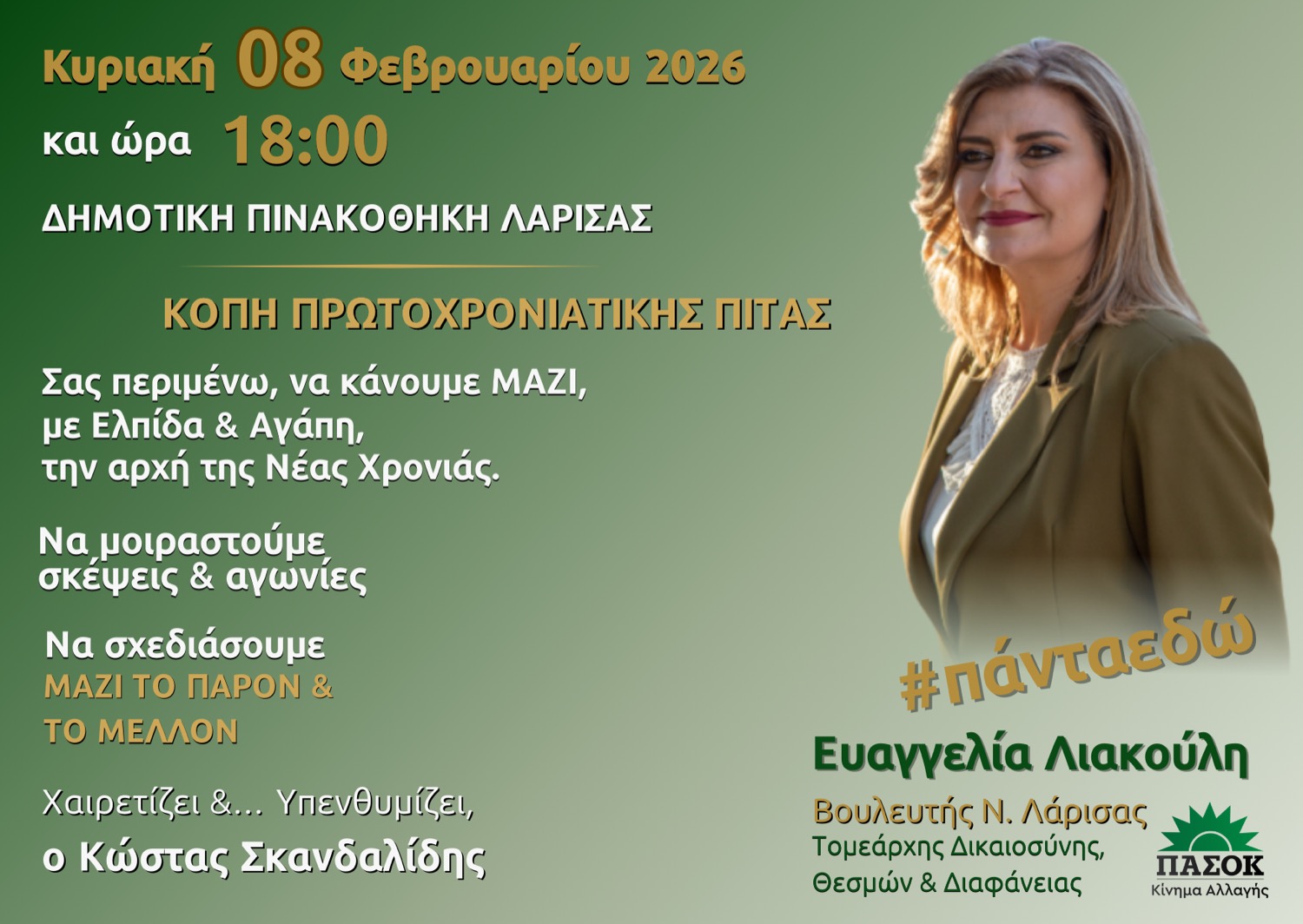Την Κυριακή 8 Φεβρουαρίου 2026, στις 18:00, στη Δημοτική Πινακοθήκη – Μουσείο Γ.Ι. Κατσίγρα στη Λάρισα, θα πραγματοποιηθεί η κοπή της πρωτοχρονιάτικης πίτας στο πλαίσιο ανοιχτής πολιτικής και κοινωνικής εκδήλωσης, την οποία διοργανώνει το πολιτικό γραφείο της Τομεάρχη Δικαιοσύνης του ΠΑΣΟΚ – Κινήματος Αλλαγής και Βουλευτή Λάρισας, Ευαγγελίας Λιακούλη.
