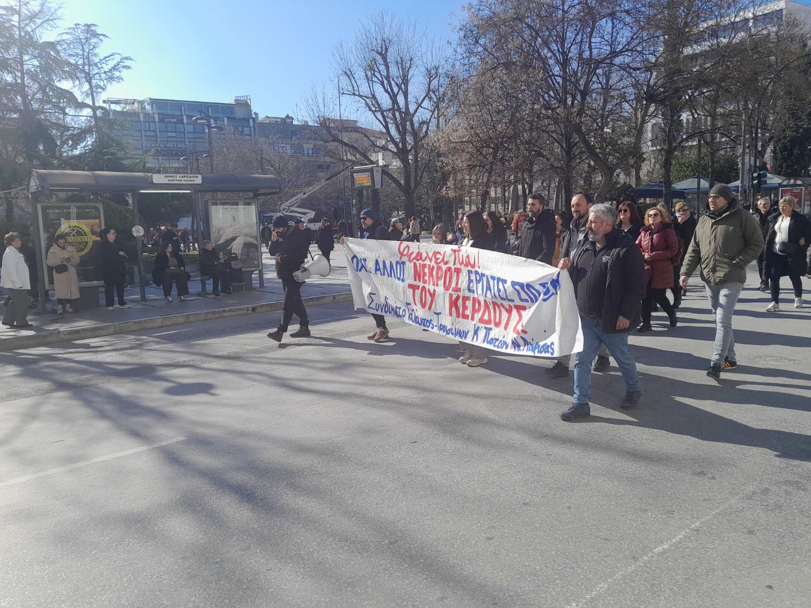 Ακολούθησε πορεία διαμαρτυρίας που ξεκίνησε από το Εργατικό Κέντρο Λάρισας και κατέληξε στο τμήμα Υγιεινής και Ασφάλειας της Επιθεώρησης Εργασίας.