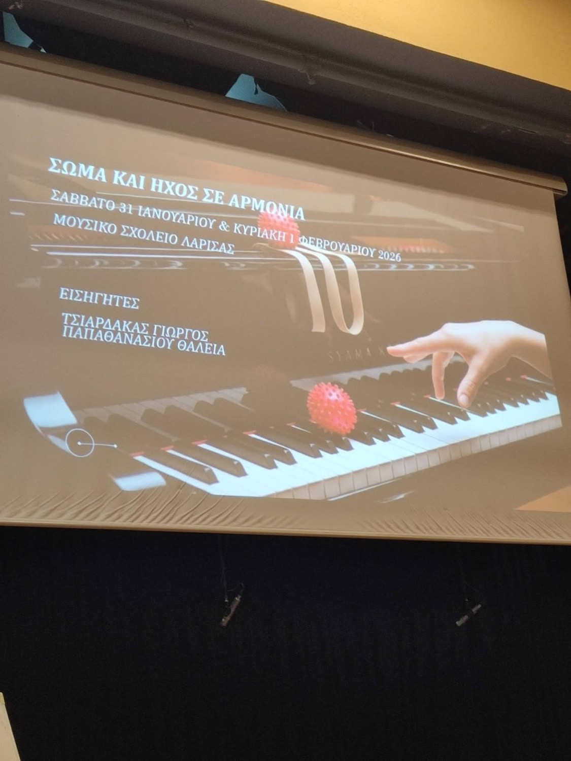 Με επιτυχία πραγματοποιήθηκε βιωματικό σεμινάριο ορθοσωμικής για μουσικούς, στο χώρο του αμφιθεάτρου του Μουσικού Σχολείου Λάρισας, το Σάββατο 31/1 και την Κυριακή 1/2/2026. Το σεμινάριο με τίτλο “ Σώμα και ήχος σε αρμονία” απευθυνόταν σε μαθητές και μαθήτριες του σχολείου, ενώ παρακολούθησαν και εκπαιδευτικοί ως ακροατές. Στο θεωρητικό μέρος οι συμμετέχοντες γνώρισαν βασικές αρχές ευθυγράμμισης του σώματος, τη σχέση ανάμεσα στη στάση, την αναπνοή και την ποιότητα του ήχου, καθώς και τα πιο συνηθισμένα προβλήματα που εμφανίζονται στους μουσικούς. Επιπλέον, συζητήθηκε το ζήτημα σωστών συνηθειών μελέτης και απλών στρατηγικών πρόληψης τραυματισμών. Στο πρακτικό μέρος εφαρμόστηκαν ασκήσεις προθέρμανσης, διατάσεων, ισορροπίας και απλές ασκήσεις επίγνωσης σώματος, ενώ συνδέθηκε πρακτικά και άμεσα η στάση με τον ήχο, χρησιμοποιώντας τα μουσικά όργανα.