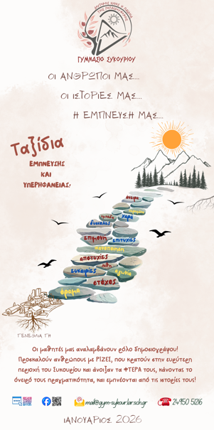 Σε μια ατμόσφαιρα βαθιάς συγκίνησης, έμπνευσης και ουσιαστικού διαλόγου, το Σάββατο 31 Ιανουαρίου 2026 και ώρα 7.00μμ, πραγματοποιήθηκε στο Γυμνάσιο Συκουρίου η εκδήλωση με τίτλο «Ρίζες και Φτερά». Μια δράση που υπενθύμισε πως το σχολείο δεν είναι μόνο χώρος μάθησης, αλλά τόπος καλλιέργειας αξιών, ονείρων και ελπίδας.