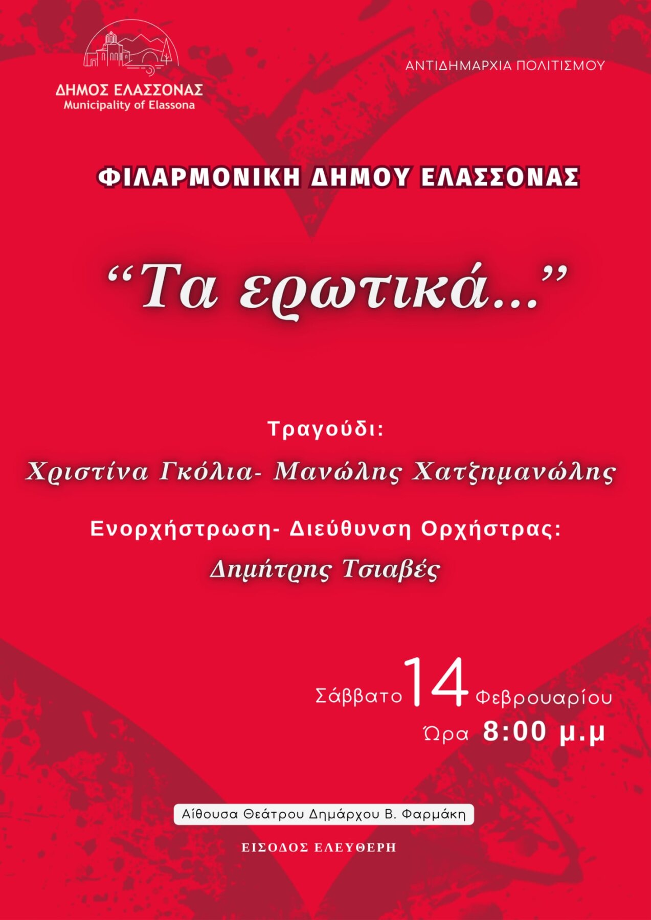Η ετήσια συναυλία της Φιλαρμονικής με τίτλο «Τα ερωτικά», θα πραγματοποιηθεί το Σάββατο 14 Φεβρουαρίου 2026 και ώρα 19:30, στην Αίθουσα Θεάτρου «Δημάρχου Βασ. Φαρμάκη» με ελεύθερη είσοδο για το κοινό.