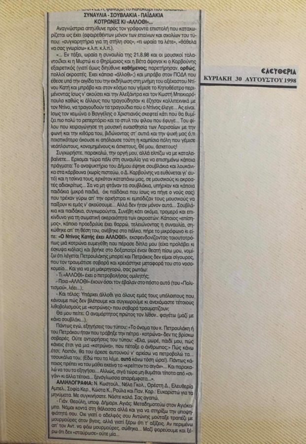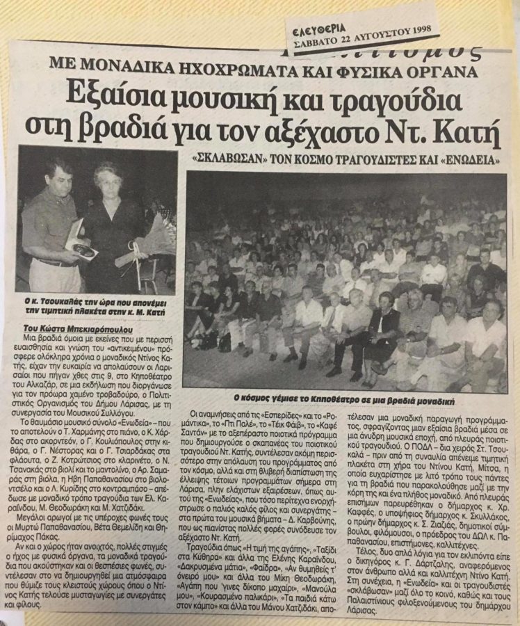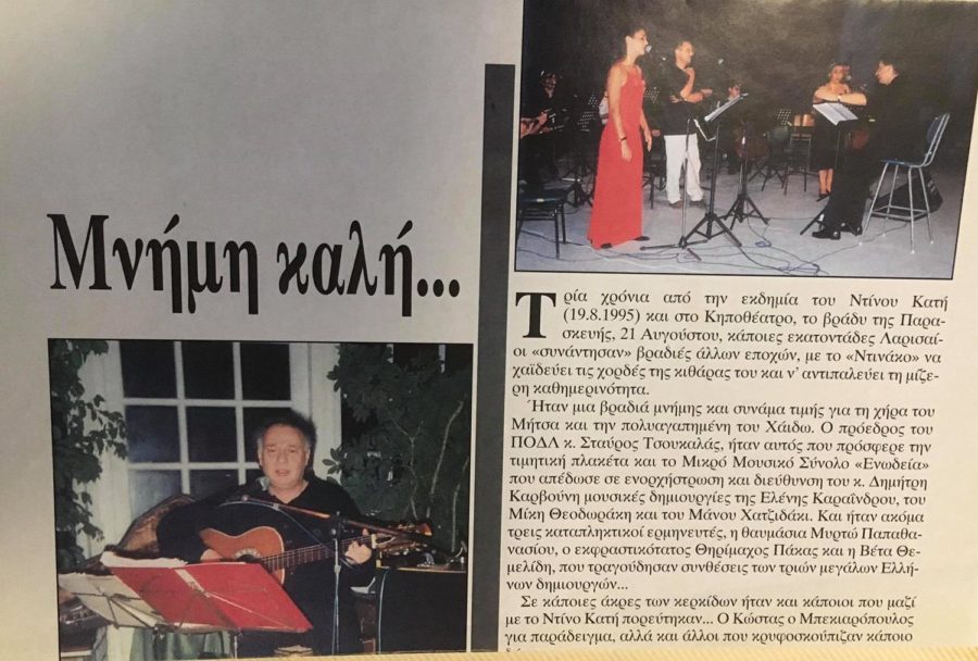 Ομολογώ πως ένιωσα μια ζήλια, γιατί έχασα όλο αυτό που είχαν ζήσει εκείνοι και τόσοι άλλοι Λαρισαίοι… Τους ευχαριστώ για τη συνομιλία μας, το φωτογραφικό υλικό παραχώρησε στο onlarissa.gr η Χάιδω Κατή. Ευχαριστώ ιδιαίτερα τον κ. Καλογιάννη για το ηχητικό απόσπασμα από το τραγούδι του Γιάννη Αργύρη «Ιδανικό μου» σε εκτέλεση Ντίνου Κατή και ενορχήστρωση του ιδίου, που προέρχεται από τις εμφανίσεις τους στο The Club και το οποίο είναι ανέκδοτο και ακούγεται σε πανελλήνια βάση για πρώτη φορά.