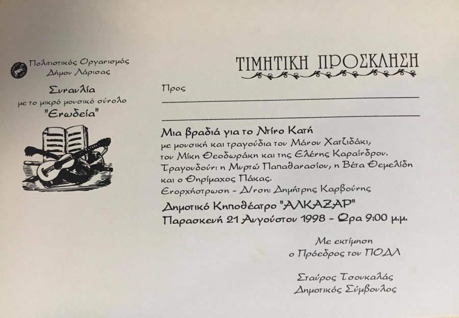 Αν και δεν έχω προλάβει καμία από τις λαρισαϊκές μπουάτ, ούτε έχω γνωρίσει τον ίδιο τον Ντίνο Κατή, η ατμόσφαιρα που μου περιγράφουν και οι ιστορίες που μου διηγούνται η κόρη του Χάιδω Κατή και ο Ανδρέας Καλογιάννης, με ένα περίεργο, σχεδόν αντανακλαστικό τρόπο, ξυπνούν μνήμες της δικής μου παιδικής ηλικίας μέσα από τις μουσικές που ακούγονταν στο σπίτι μας και τις διηγήσεις της μητέρας μου για την εποχή που οι Λαρισαίοι έβγαιναν με τις παρέες τους, τραγουδούσαν και στο τέλος της βραδιάς κατέληγαν να γίνονται όλοι τους μία και μόνο παρέα στα μικρά μαγαζιά που φιλοξενούσαν τις λαρισαϊκές μπουάτ.