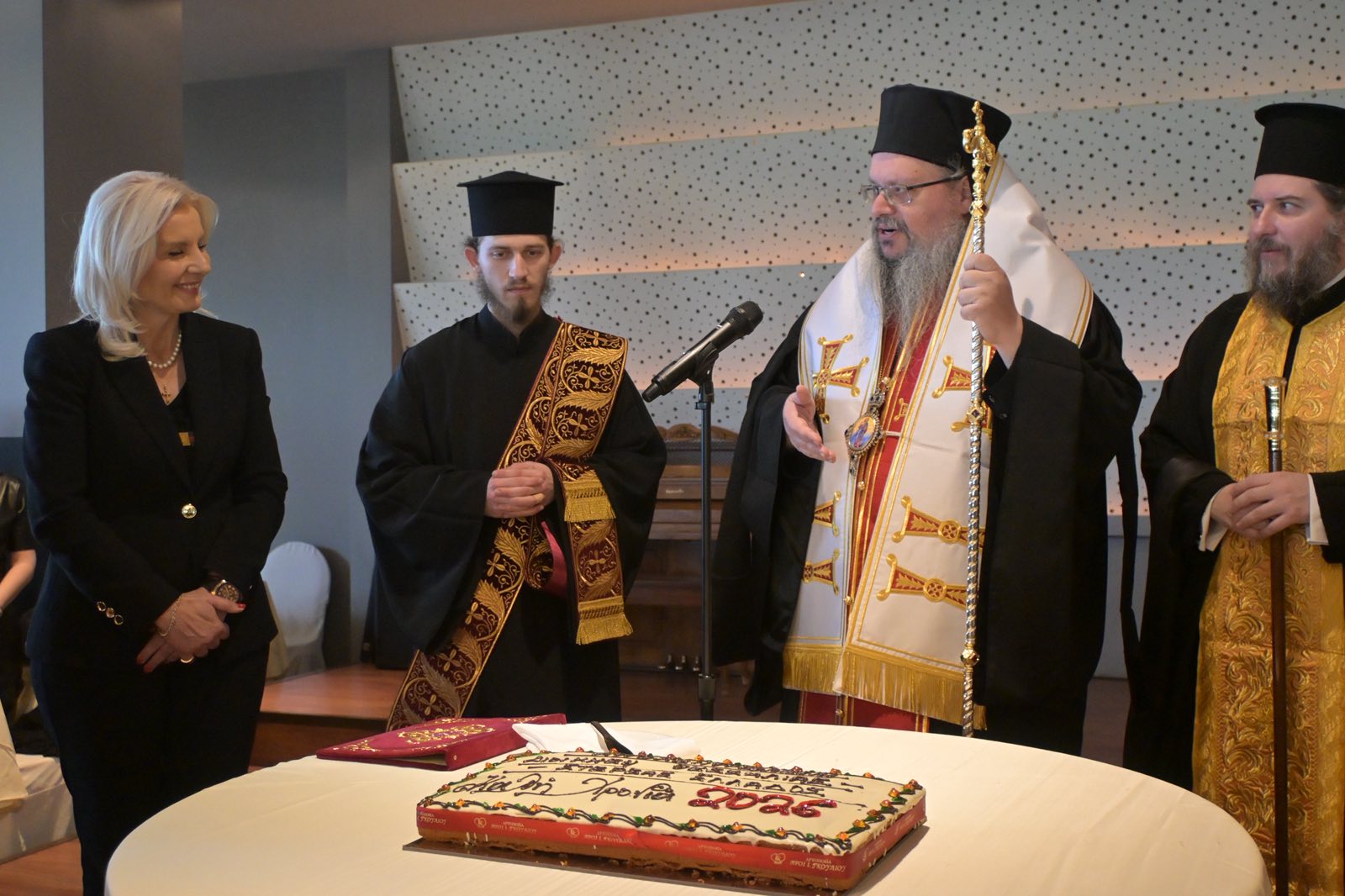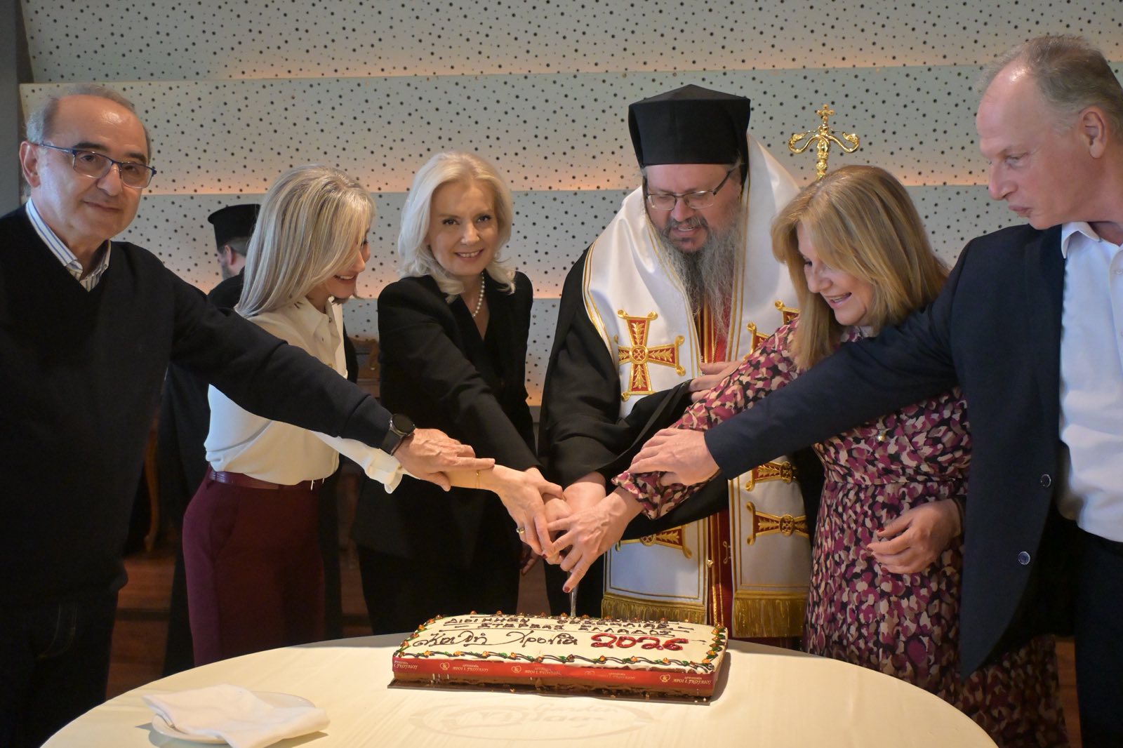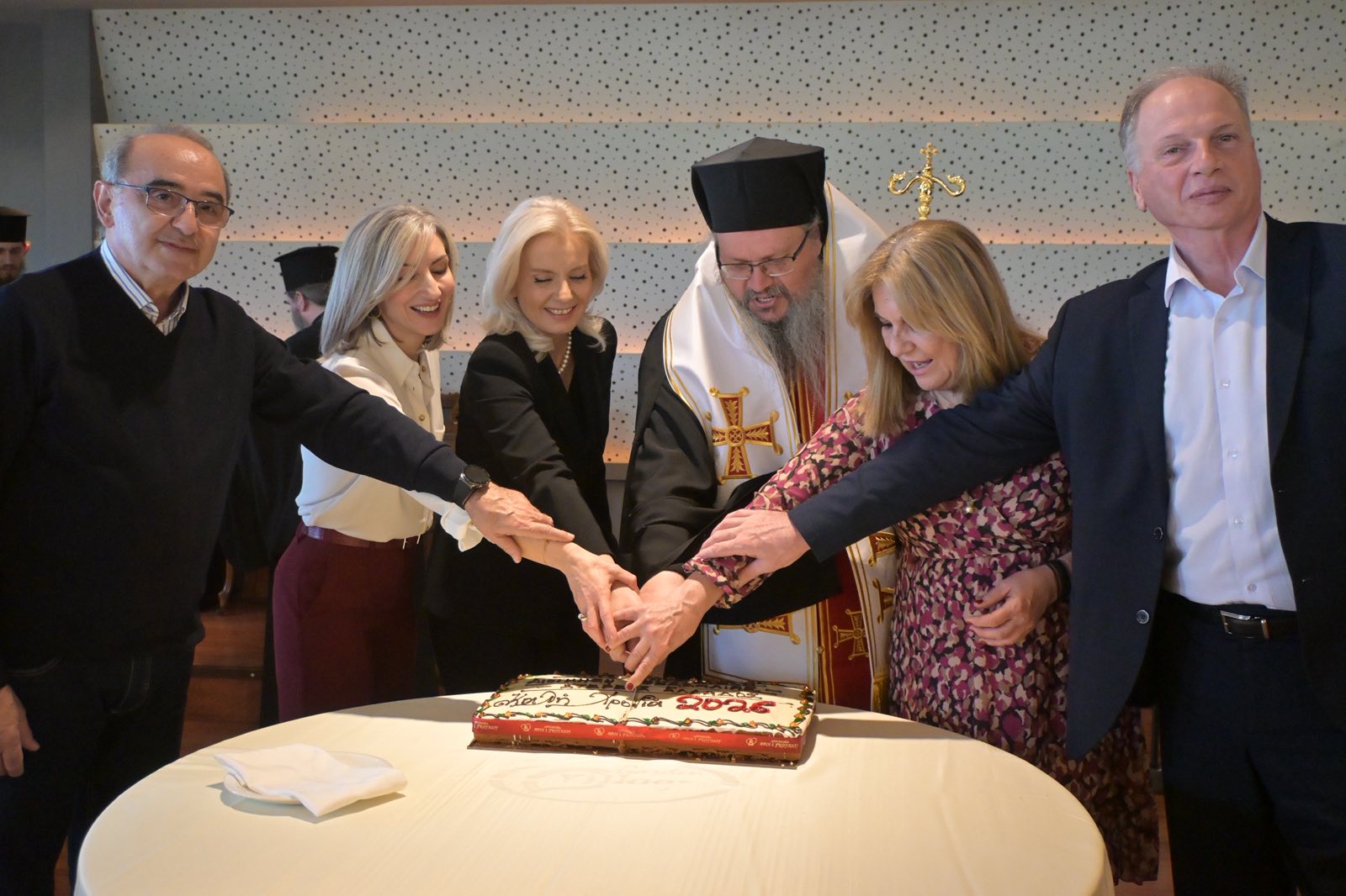 Την πίτα ευλόγησε ο Σεβασμιότατος Μητροπολίτης Λαρίσης και Τυρνάβου κ.κ. Ιερώνυμος, στην παρουσία του οποίου στάθηκε η Γενική Γραμματέας, λέγοντας πως αυτή του ακριβώς η παρουσία δίνει ιδιαίτερη αξία στην εκδήλωση. «Το ποιμαντικό σας έργο, ο λόγος σας, η ουσιαστική στήριξή σας στην κοινωνία, αποτελούν σημείο αναφοράς για όλους μας», σημείωσε χαρακτηριστικά .