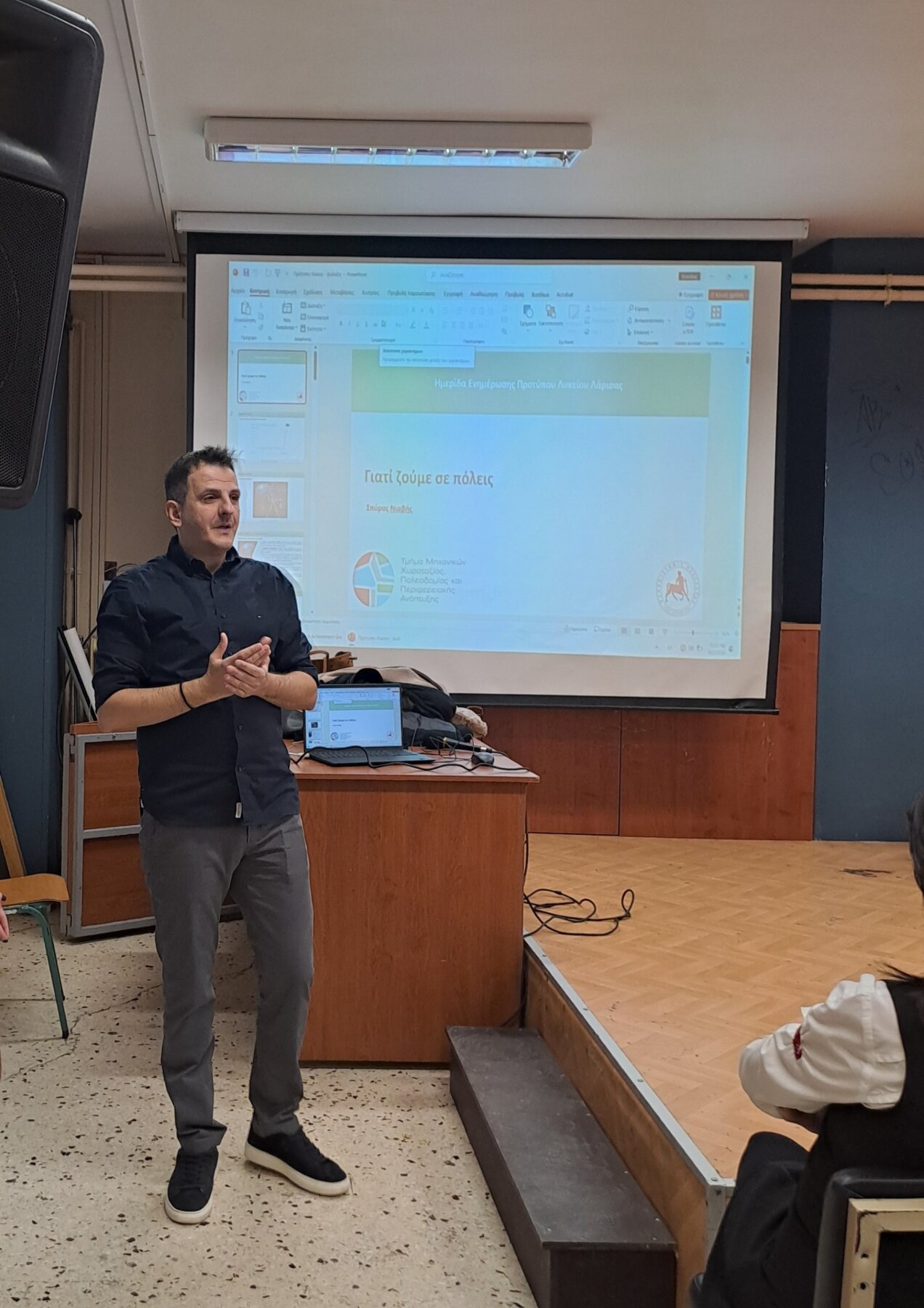 Συγκεκριμένα, ο επίκουρος καθηγητής κ. Σπυρίδων Νιαβής ανέπτυξε το θέμα «Γιατί ζούμε σε πόλεις;», εστιάζοντας στις κοινωνικές, οικονομικές και περιβαλλοντικές παραμέτρους της αστικής ανάπτυξης, ενώ η επίκουρη καθηγήτρια κ. Γεωργία Γεμενετζή παρουσίασε το θέμα «Μπορεί η πόλη να μιμηθεί τη φύση;», αναδεικνύοντας σύγχρονες προσεγγίσεις βιομιμητικού και αειφόρου αστικού σχεδιασμού. Τέλος, ο επίκουρος καθηγητής κ. Αριστοτέλης Βαρθολομαίος ανέλυσε το θέμα: «Βιώσιμες και ανθρώπινες πόλεις», παρουσιάζοντας τον ρόλο του πολεοδομικού σχεδιασμού στη διαμόρφωση της ποιότητας ζωής και της καθημερινής εμπειρίας των κατοίκων .