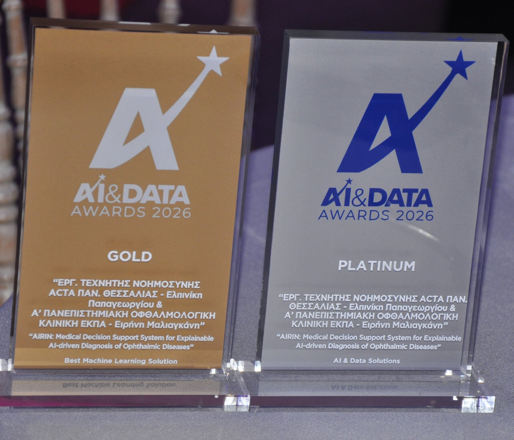 Δύο σημαντικές διακρίσεις, Platinum και Gold, απέσπασε το Εργαστήριο Τεχνητής Νοημοσύνης, Υπολογιστικών Συστημάτων και Τεχνολογικών Εφαρμογών (ACTA Lab) του Τμήματος Συστημάτων Ενέργειας του Πανεπιστημίου Θεσσαλίας, σε συνεργασία με την και η Α΄ Πανεπιστημιακή Οφθαλμολογική Κλινική του Εθνικού και Καποδιστριακού Πανεπιστημίου Αθηνών (ΕΚΠΑ), στα AI & Data Awards 2026, για το έργο AIRIN: Medical Decision Support System for Explainable AI-driven Diagnosis of Ophthalmic Diseases.