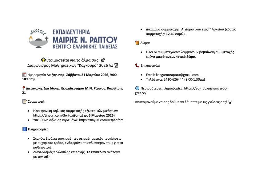 Τα Εκπαιδευτήρια Μαίρης Ν. Ράπτου θα αποτελέσουν και φέτος Κέντρο Εξέτασης για το διεθνή διασκεδαστικό μαθηματικό διαγωνισμό “Καγκουρό” (https://ed-hub.eu/kangaroo-greece/).
