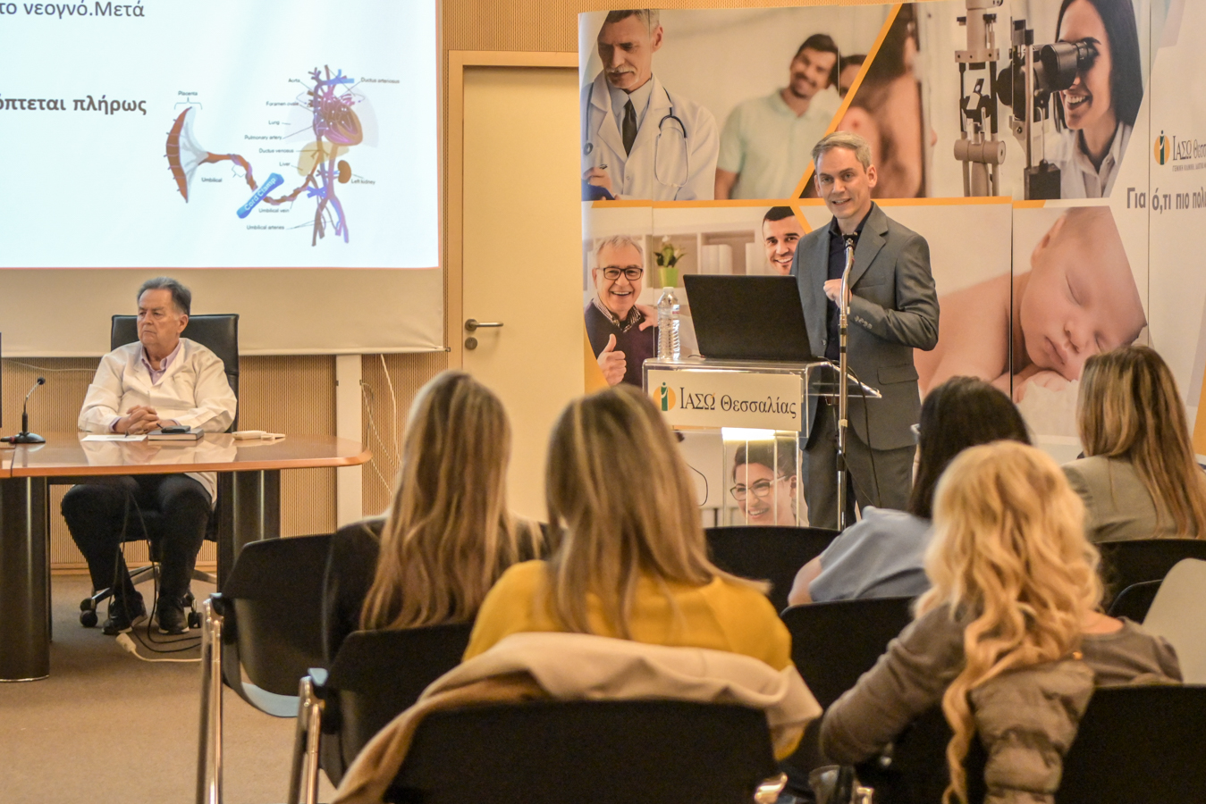 Στη συνέχεια, ο Βάιος Μπεμπές, Παιδίατρος – Νεογνολόγος και Επιστημονικός Συνεργάτης της ΜΕΝΝ ΙΑΣΩ Θεσσαλίας, ανέπτυξε το θέμα «Καθυστερημένη απολίνωση ομφάλιου λώρου – Συσχετισμός με την ηλικία κύησης και οφέλη για το νεογνό», παρουσιάζοντας τα νεότερα επιστημονικά δεδομένα και τα τεκμηριωμένα οφέλη της πρακτικής αυτής, ιδιαίτερα για τα πρόωρα νεογνά, σε επίπεδο αιμοδυναμικής προσαρμογής και συνολικής νεογνικής έκβασης.