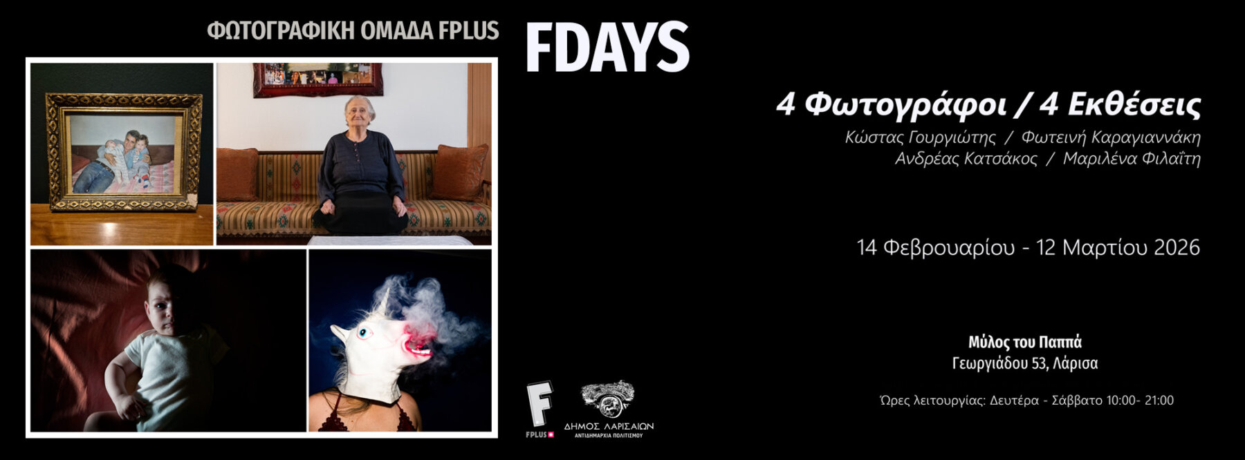 Το πρώτο FDAYS διοργανώνουν η Αντιδημαρχία Πολιτισμού του Δήμου Λαρισαίων και η Φωτογραφική Ομάδα fplus, από το Σάββατο 14 Φεβρουαρίου έως και την Πέμπτη 12 Μαρτίου 2026. Πρόκειται για μια σειρά δράσεων αφιερωμένων στη φωτογραφία. Όλες οι εκθέσεις θα φιλοξενηθούν στον εκθεσιακό χώρο του ισογείου του κεντρικού κτιρίου του Μύλου του Παππά, με ώρες λειτουργίας Δευτέρα–Σάββατο 10:00–21:00 (Κυριακή κλειστά).