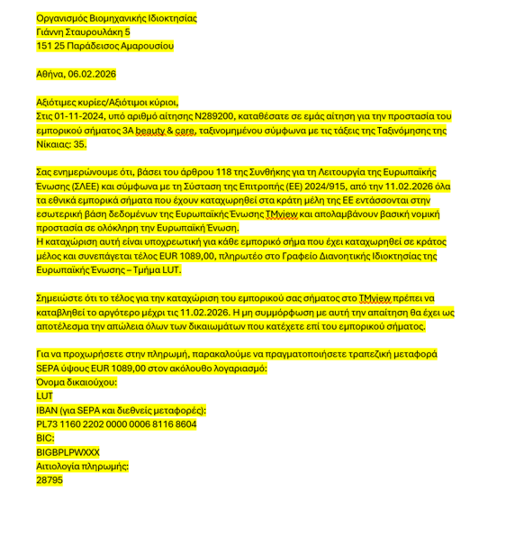 Όπως αναφέρει ο Οργανισμός Βιομηχανικής Ιδιοκτησίας, σε περίπτωση που παραληφθεί σχετικό μήνυμα ή υπάρχουν αμφιβολίες για τη γνησιότητά του, παρακαλείται το κοινό να μην προχωρήσει σε καμία πληρωμή και να επικοινωνήσει άμεσα με τον Οργανισμό μέσω των επίσημων στοιχείων επικοινωνίας που αναγράφονται στην ιστοσελίδα του: One Stop Shop: 210-6183580, 582 και τμήμα επικοινωνίας: 210- 6183618.