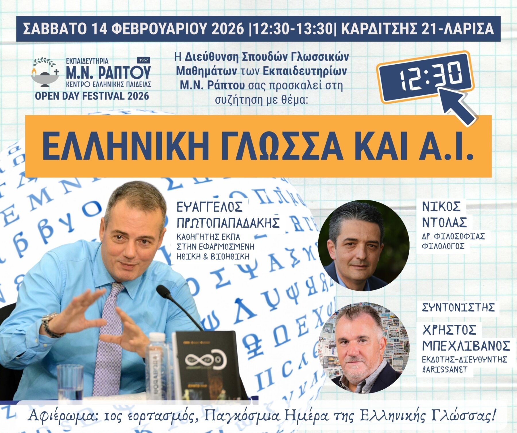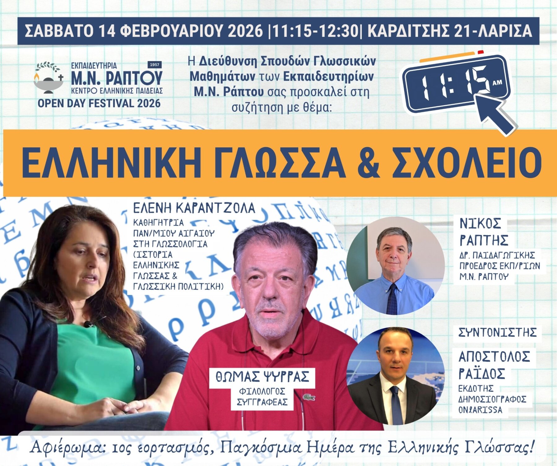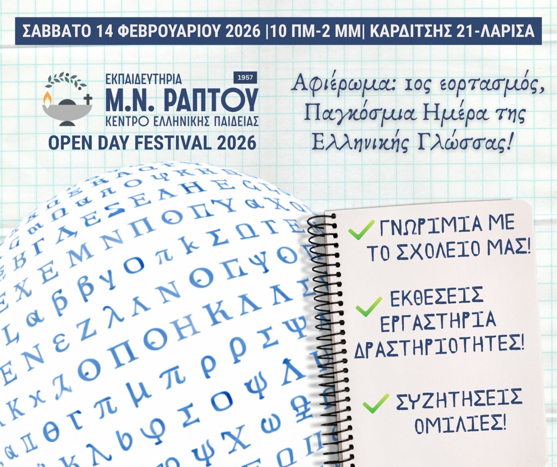 Στον 1ο εορτασμό της Παγκόσμιας Ημέρας της Ελληνικής Γλώσσας είναι αφιερωμένο το φετινό Open Day Festival των Εκπαιδευτηρίων Μ.Ν. Ράπτου. Οι διάφορες εκδηλώσεις θα διεξαχθούν στις εγκαταστάσεις των Εκπαιδευτηρίων στη Νεράιδα (Καρδίτσης 21) το Σάββατο 14 Φεβρουαρίου 2026, και από τις 10 π.μ. έως τις 2 μ.μ.