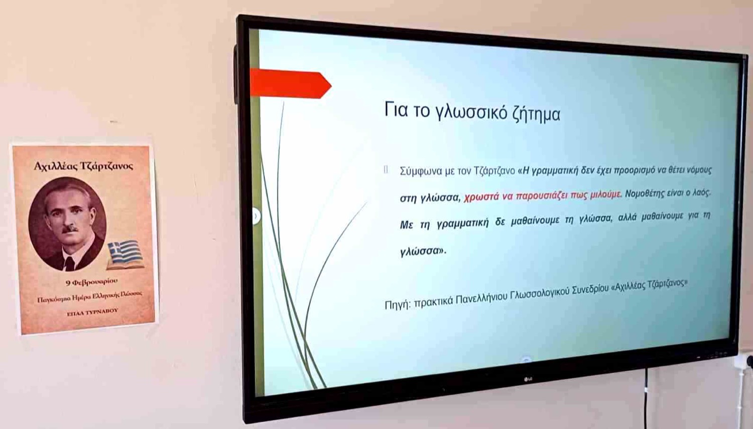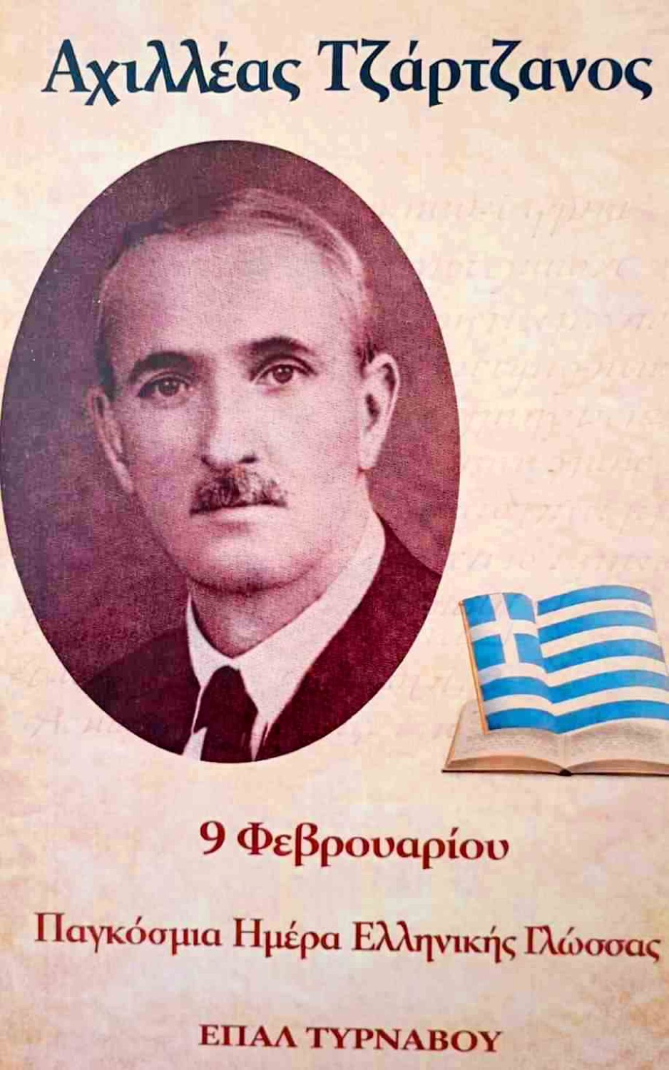 Το ΕΠΑΛ Τυρνάβου, με αφορμή τον εορτασμό της Παγκόσμιας Ημέρας Ελληνικής Γλώσσας (9 Φεβρουαρίου), πραγματοποίησε εκδήλωση αφιερωμένη στη ζωή και το έργο του μεγάλου δασκάλου του Τυρνάβου, Αχιλλέα Τζάρτζανου. Στο πλαίσιο αυτής, οι μαθητές/τριες είχαν την ευκαιρία να γνωρίσουν μέσα από το οπτικό, φωτογραφικό και ηχητικό υλικό την τεράστια συμβολή του Αχιλλέα Τζάρτζανου στα γράμματα και να συνειδητοποιήσουν ότι η γλώσσα ως “ζωντανός οργανισμός” εξελίσσεται διαρκώς.