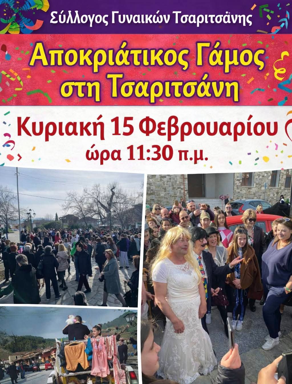 Η Τσαριτσάνη ετοιμάζεται να ζήσει στιγμές απείρου κάλλους, καθώς ο Σύλλογος Γυναικών δίνει το σύνθημα για το πιο ανατρεπτικό δρώμενο της χρονιάς, τον Παραδοσιακό Αποκριάτικο Γάμο. Ξεχάστε τα σοβαρά προσκλητήρια και τις επίσημες τουαλέτες, καθώς εδώ το πρωτόκολλο επιτάσσει περούκες, μουστάκια, χιούμορ και πολύ κέφι.