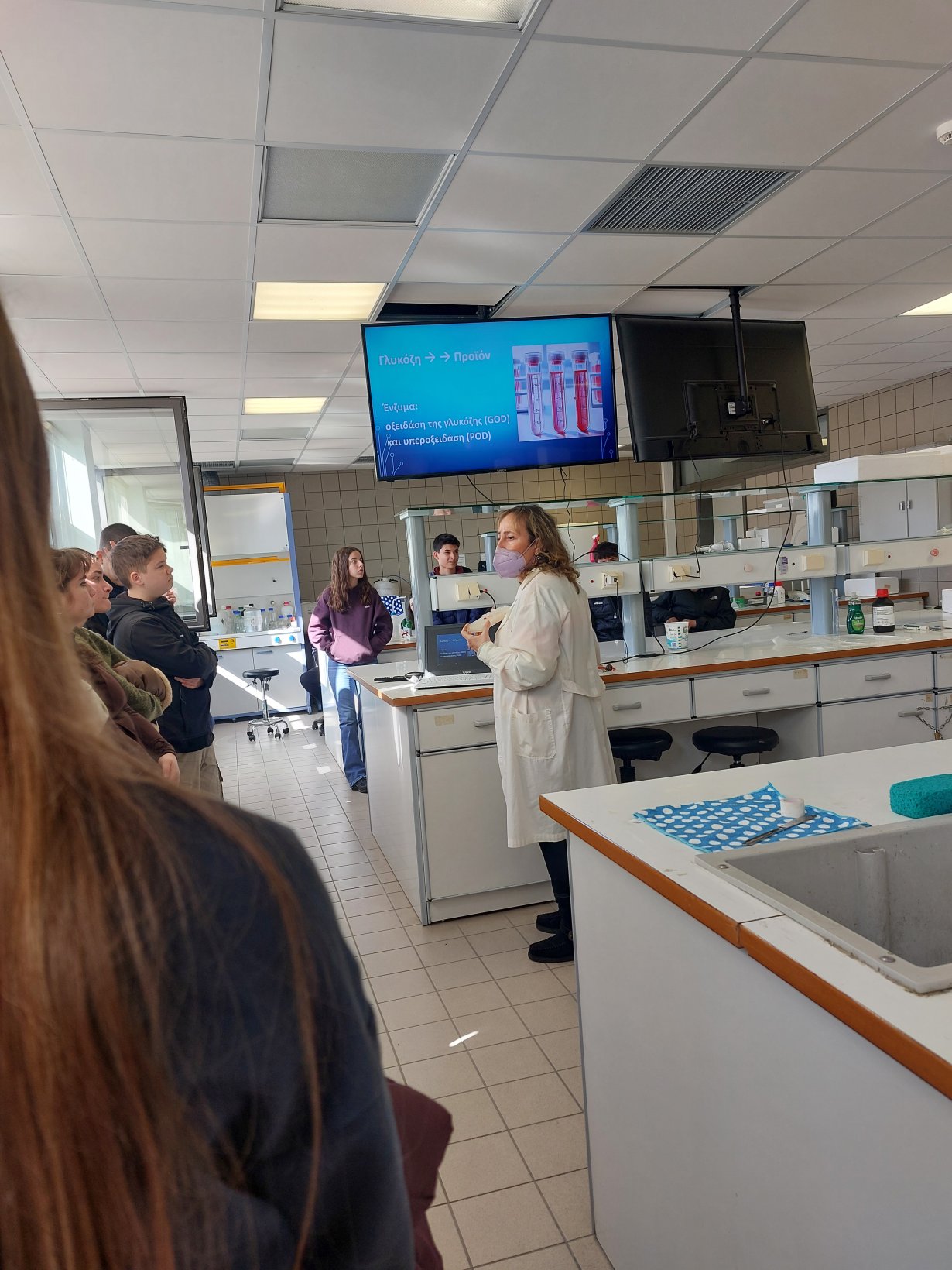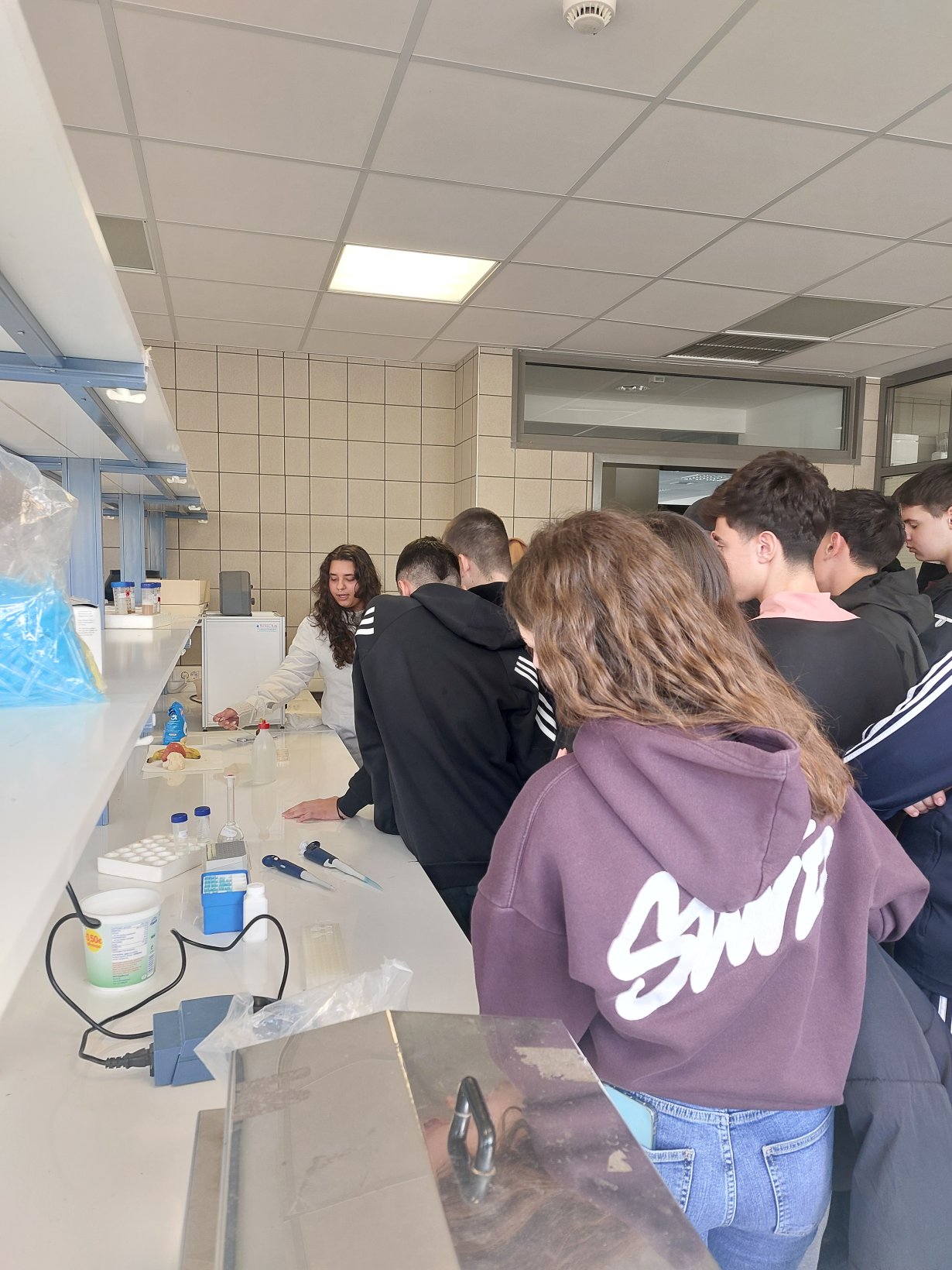 Στη συνέχεια οι μαθητές χωρίστηκαν σε δύο ομάδες για ευκολία στη ξενάγηση, παίξανε παιχνίδια με θέμα τη διατροφή, μίλησαν για μύθους και αλήθειες γύρω από το φαγητό, και έγιναν για λίγο μικροί βιοχημικοί παρακολουθώντας πειράματα σε πραγματικό χρόνο από την επίκουρο καθηγήτρια κα Μαρία Κοντού στο εργαστήριό της.