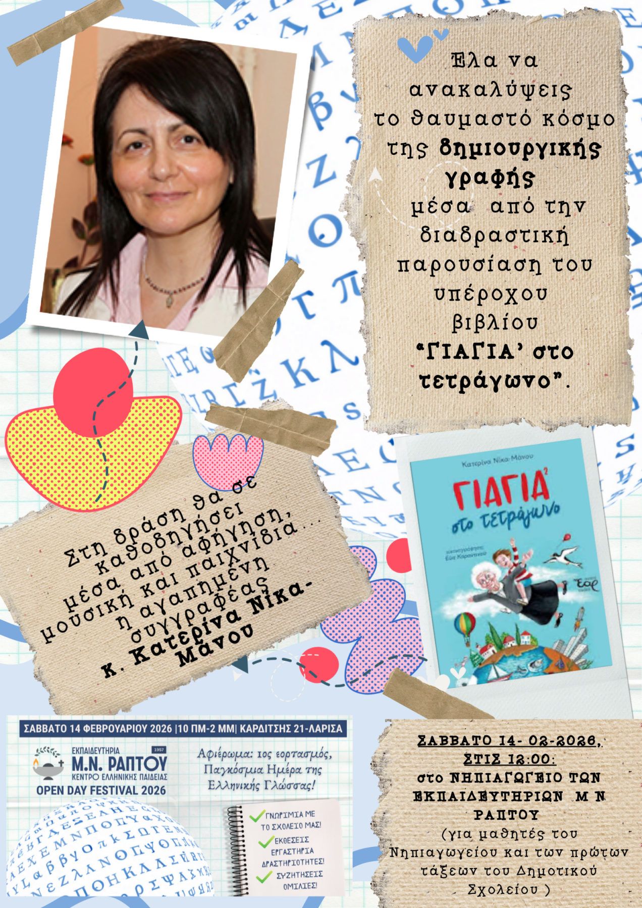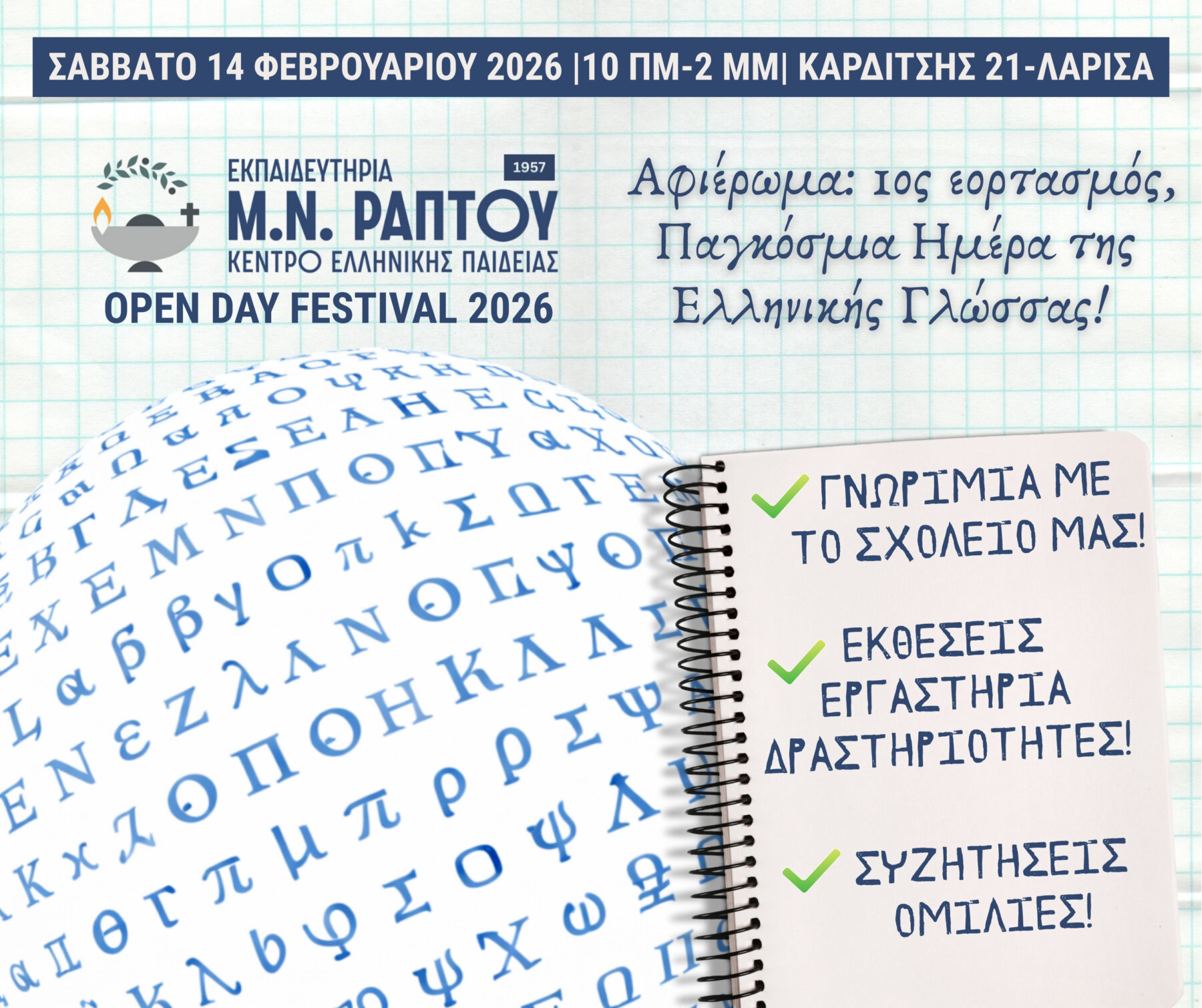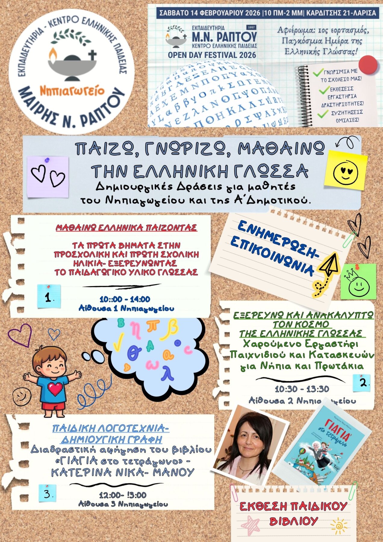 Το Νηπιαγωγείο των Εκπαιδευτηρίων Μ. Ν. Ράπτου συμμετέχει ενεργά στο Open Day Festival, το οποίο θα πραγματοποιηθεί το Σάββατο 14 Φεβρουαρίου 2026, στις εγκαταστάσεις των Εκπαιδευτηρίων στη Νεράιδα Λάρισας, στο πλαίσιο του εορτασμού της Παγκόσμιας Ημέρας της Ελληνικής Γλώσσας.
