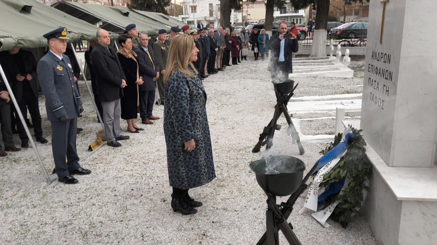 Η κα Λιακούλη κατέθεσε στεφάνι, αποτείοντας φόρο τιμής στη μνήμη των πεσόντων, τιμώντας την αυταπάρνηση και την ανιδιοτελή προσφορά τους στην προάσπιση της εθνικής κυριαρχίας και της εδαφικής ακεραιότητας της χώρας.