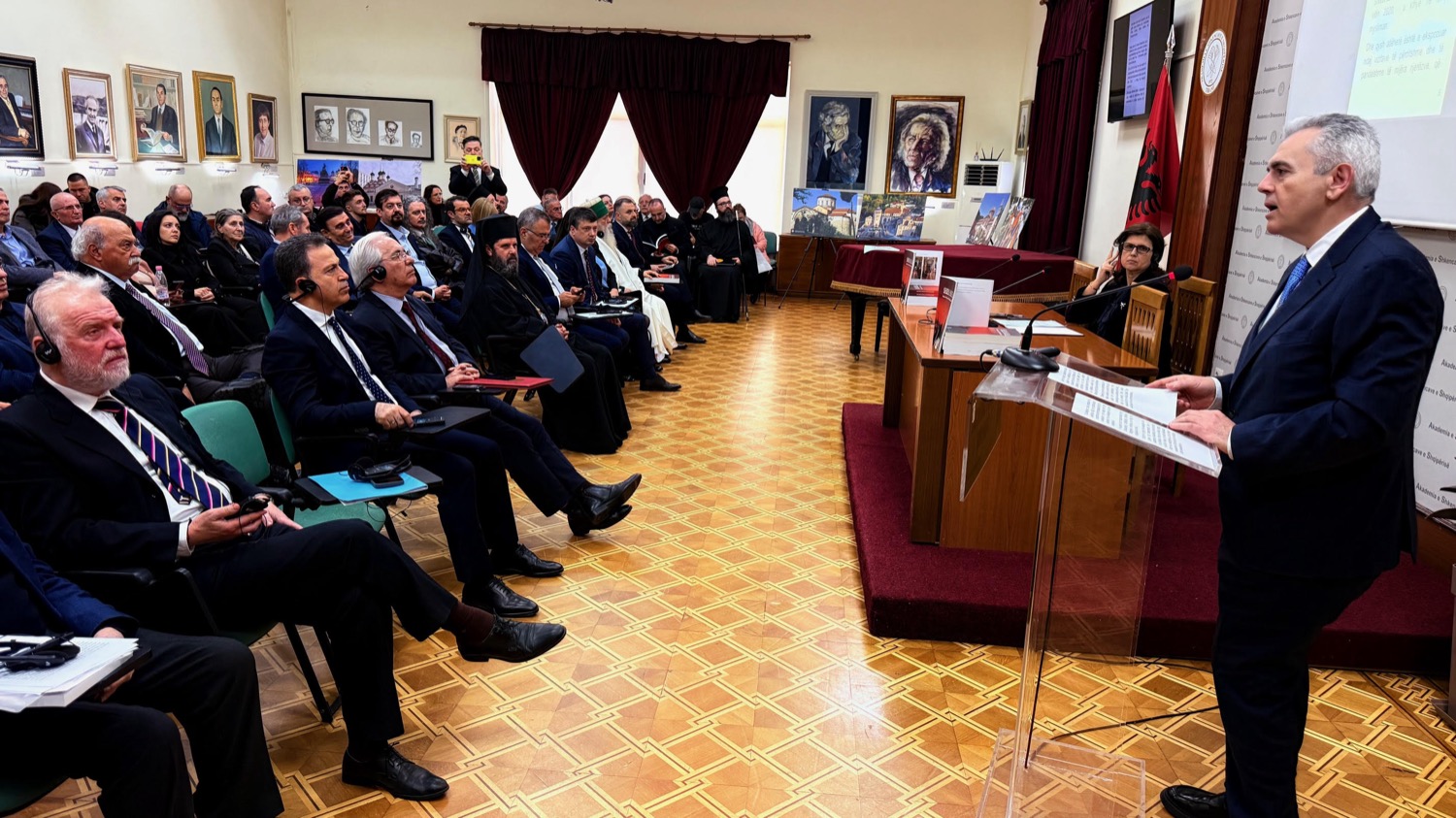Εκτός του Μάξιμου Χαρακόπουλου, για τον Τόμο μίλησαν επίσης ο Πρόεδρος της Ακαδημίας Επιστημών κ. Σκέντερ Γκινιούσι, ο Πρόεδρος της Βουλής της Αλβανίας κ. Νίκο Πελέσι, ο Βουλευτής κ. Βαγγέλης Ντούλες, οΑρχιεπίσκοπος Τιράνων, Δυρραχίου και πάσης Αλβανίας κ. Ιωάννης, ο πρώην Υπουργός Παιδείας και Επιστημών κ. Γκεντς Πόλλο, ο Καθηγητής Αρχιτεκτονικής στο Πολυτεχνείο των Τιράνων δρ Πύρρο Θώμο.