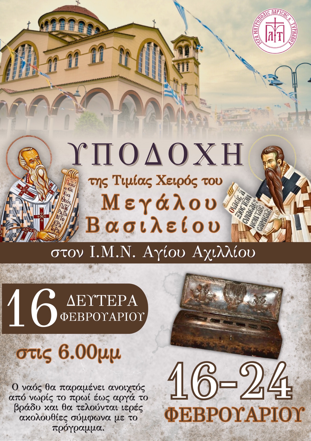 Με πολλή χαρά και ιδιαίτερη τιμή, τη Δευτέρα 16 Φεβρουαρίου, στον Ιερό Μητροπολιτικό Ναό του Αγίου Αχιλλίου, ο Λαρισαϊκός λαός, με επικεφαλής τον Σεβασμιώτατο Μητροπολίτη Λαρίσης και Τυρνάβου, κ. Ιερώνυμο, θα υποδεχτεί την Τιμία δεξιά Χείρα του Μεγάλου Βασιλείου, του σπουδαίου Οικουμενικού Διδασκάλου της Εκκλησίας μας, που ως πολύτιμος θησαυρός φυλάσσεται στην Ιερά Σύνοδο της Εκκλησίας της Ελλάδος και πολλές φορές ευωδιάζει στέλνοντας ποικίλα μηνύματα…