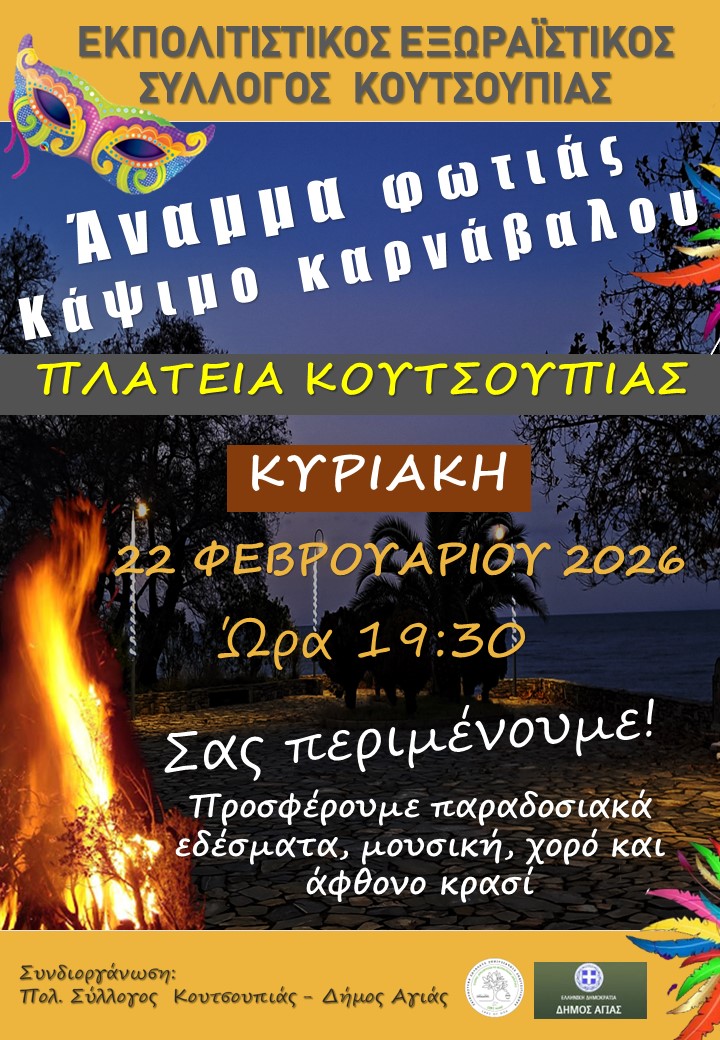 Ο Εκπολιτιστικός Εξωραϊστικός Σύλλογος Κουτσουπιάς σε συνεργασία με το Δήμο Αγιάς αναβιώνει το έθιμο της πυράς στην πλατεία της Κουτσουπιάς την Κυριακή 22 Φεβρουαρίου, ώρα 7 και μισή το απόγευμα και προσκαλεί τους/τις φίλους/ες του συλλόγου να παραβρεθούν και να διασκεδάσουν με μουσική, χορό, κρασί και πλούσια αποκριάτικα εδέσματα.