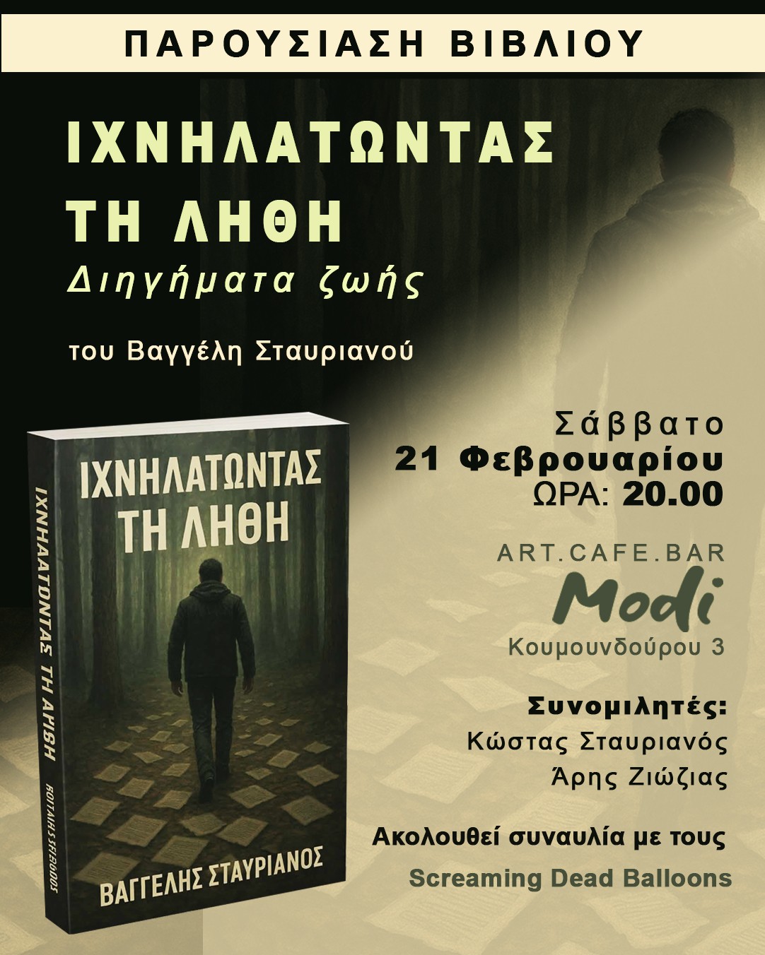 Παρουσίαση του βιβλίου «Ιχνηλατώντας τη Λήθη» πραγματοποιεί ο Σταυριανός Βαγγέλης στη Λάρισα και το Modi Art Cafe Bar, το Σάββατο 21 Φεβρουαρίου στις 8 μ.μ..