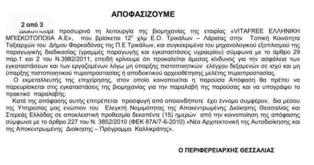 Την προσωρινή διακοπή λειτουργίας της βιομηχανίας της εταιρίας VITAFREE ΕΛΛΗΝΙΚΗ ΜΠΙΣΚΟΤΟΠΟΙΙΑ Α.Ε. (ΒΙΟΛΑΝΤΑ), στους Ταξιάρχες, αποφάσισε ο περιφερειάρχης Θεσσαλίας Δημήτρης Κουρέτας, λίγο μετά τις 3 το μεσημέρι της Δευτέρας, λόγω σοβαρών ελλείψεων που σχετίζονται με την ασφάλεια των εγκαταστάσεων και των εργαζομένων.