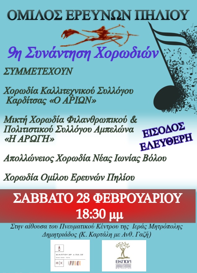 Ο Φιλανθρωπικός και Πολιτιστικός Σύλλογος «Η ΑΡΩΓΗ» Αμπελώνα με ιδιαίτερη χαρά ανακοινώνει τη συμμετοχή της Μικτής χορωδίας του, στην 9η Συνάντηση Χορωδιών η οποία διοργανώνεται από τον Όμιλο Ερευνών Πηλίου με έδρα την Αγριά Βόλου .