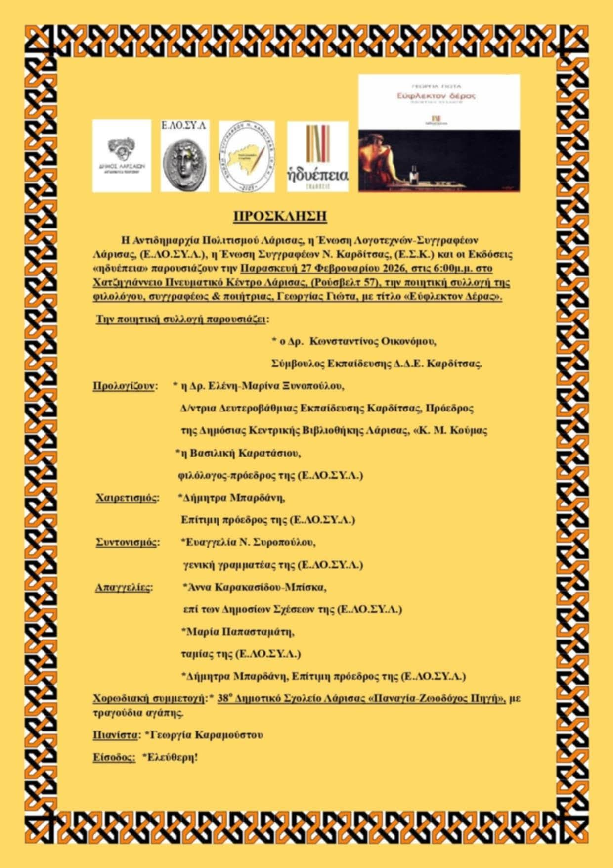 Την Παρασκευή 27 Φεβρουαρίου 2026 στις 6:00 μ.μ. στο Χατζηγιάννειο Πνευματικό κέντρο Λάρισας η Ένωση Λογοτεχνών – Συγγραφέων Λάρισας, (Ε.ΛΟ.ΣΥ.Λ.), παρουσιάζει την ποιητική συλλογή του μέλους της, φιλολόγου και ποιήτριας, Γεωργίας Γιώτα με τίτλο “Εύφλεκτον Δέρας”.
