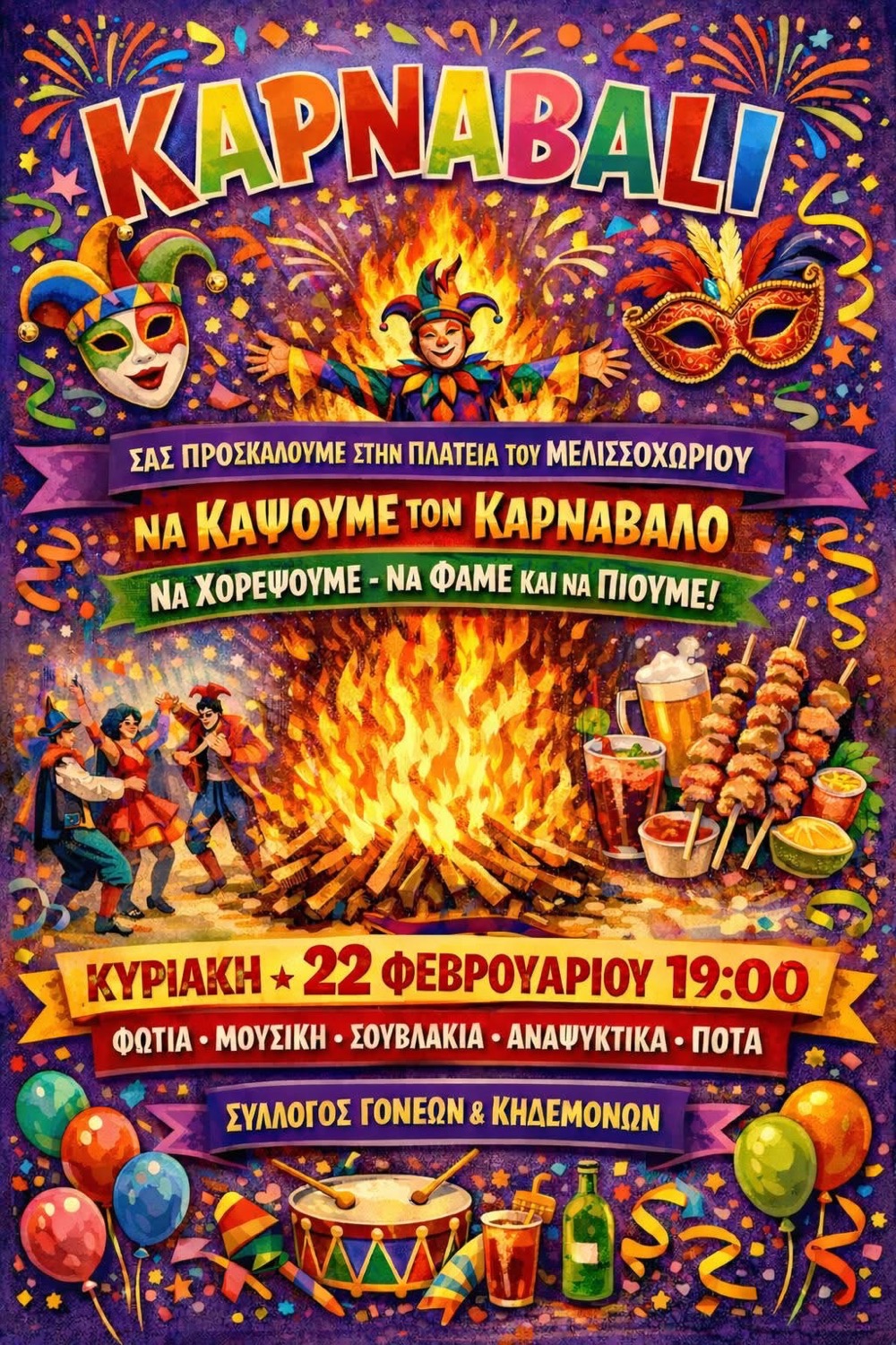 Κυριακή της Αποκριάς 22 Φεβρουαρίου στις 18:30 Αχίλλειο, Μ. Μοναστήρι, Νίκη, Σωτήριο, Αγναντερή, Μέλισσα, Νίκαια, Ελευθέριο και Μελισσοχώρι