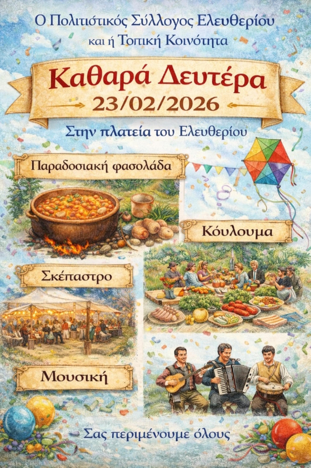 Καθαρά Δευτέρα 23 Φεβρουαρίου στις 10:00 Νίκαια, Καλαμάκι, Κιλελέρ, Νέο Περιβόλι, Αγ. Ανάργυροι, Κυπάρισσος, Μικρό Βουνό, Δίλοφο, Καλό Νερό, Μοσχοχώρι, Μύρα, Νέες Καρυές, Σοφό, Γαλήνη, Γλαύκη, Μελία, Μελισσοχώρι, Ομορφοχώρι, Πλατύκαμπος, Χάλκη, Νάματα, Δοξαράς και Ζάππειο.