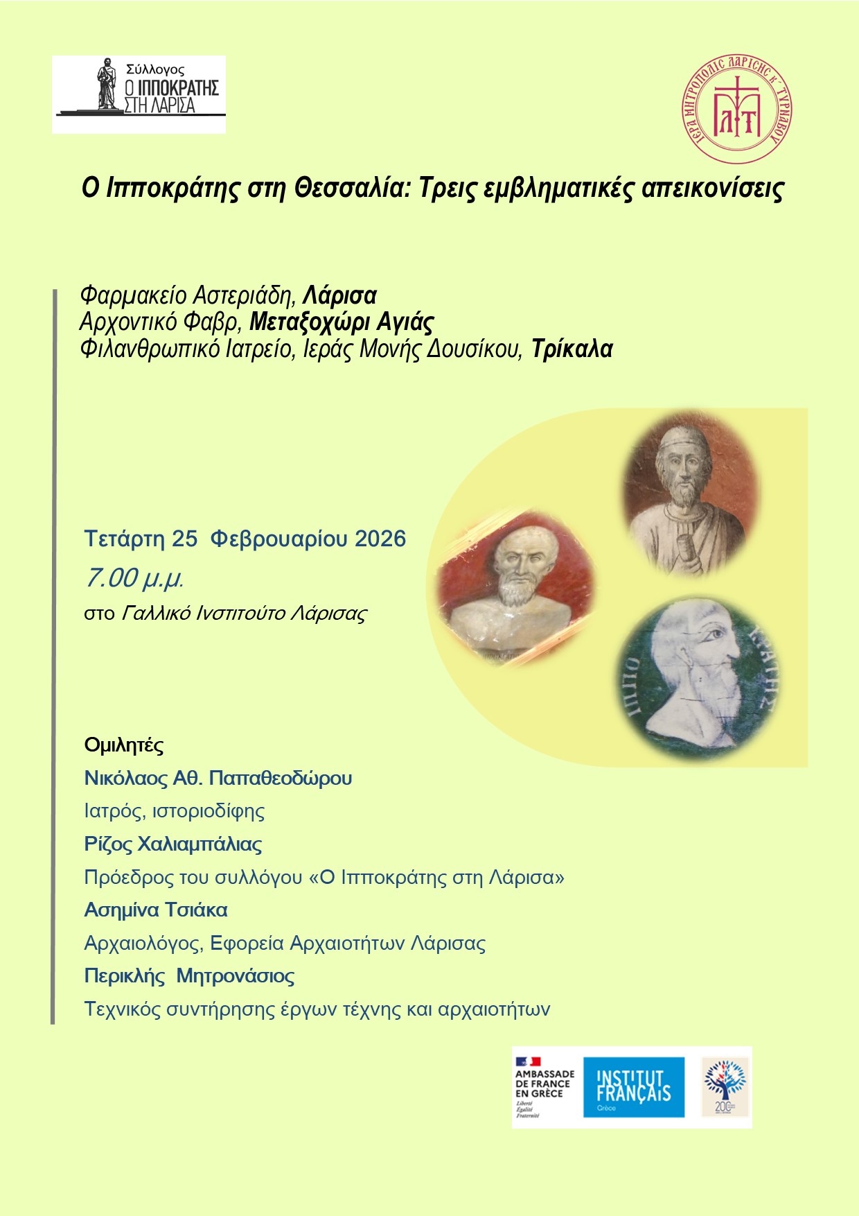 Στην αίθουσα εκδηλώσεων του Γαλλικού Ινστιτούτου Λάρισας θα πραγματοποιηθεί εκδήλωση με τίτλο «Ο Ιπποκράτης στη Θεσσαλία: Τρεις εμβληματικές απεικονίσεις» την Τετάρτη 25 Φεβρουαρίου 2026, στις 7 μμ. Η εκδήλωση διοργανώνεται από το σύλλογο «Ο Ιπποκράτης στη Λάρισα» και την Ιερά Μητρόπολη Λαρίσης & Τυρνάβου με την υποστήριξη του Γαλλικού Ινστιτούτου Λάρισας – Γαλλική Πρεσβεία.