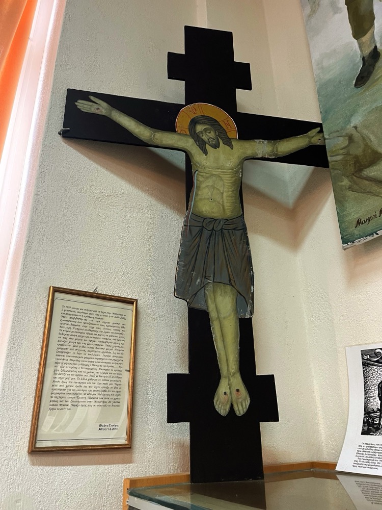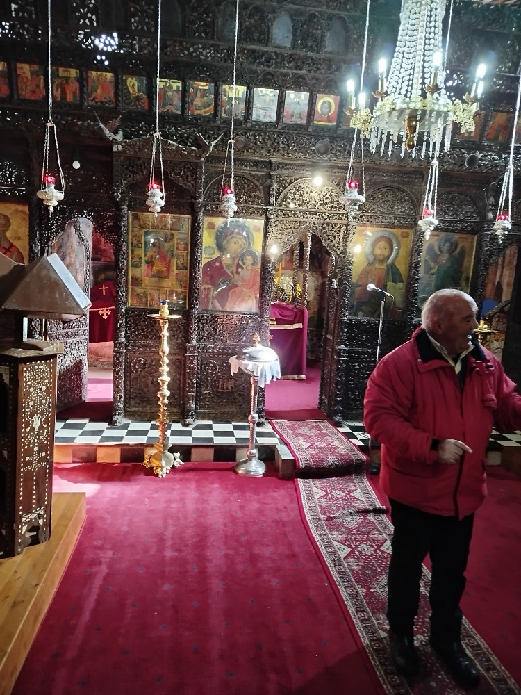 Στη συνέχεια τα μέλη του Συλλόγου ξεναγήθηκαν στον Ιερό Ναό του Αγίου Γεωργίου, έναν ναό αριστούργημα της μεταβυζαντινής περιόδου, και όλοι θαύμασαν την περίτεχνα ζωγραφισμένη ξύλινη οροφή -ένα τέλειο «αραβούργημα»-, το ξυλόγλυπτο τέμπλο, τις τοιχογραφίες της Κρητικής σχολής, τα προσκυνητάρια από φίλντισι, τους πολυέλαιους από την Κωνσταντινούπολη κ.α. Τέλος επισκέφτηκαν το παρεκκλήσι του Αγίου Σεραφείμ που φιλοξενεί το Μουσείο Βυζαντινής και Μεταβυζαντινής Τέχνης, όπου επίσης υπάρχουν πολύτιμες εικόνες και ιερά βιβλία, καθώς επίσης και το λαογραφικό μουσείο του χωριού.