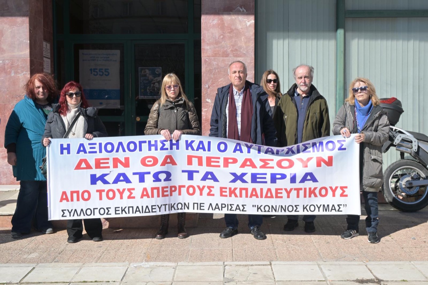 Παράσταση διαμαρτυρίας πραγματοποίησαν σήμερα, Τετάρτη (18/02), εκπαιδευτικοί της Λάρισας, έπειτα από κοινό κάλεσμα του Συλλόγου Πρωτοβάθμιας Εκπαίδευσης «Κωνσταντίνος Κούμας» και της ΕΛΜΕ του νομού, συγκεντρωμένοι έξω από τη Διεύθυνση Πρωτοβάθμιας Εκπαίδευσης της πόλης.
