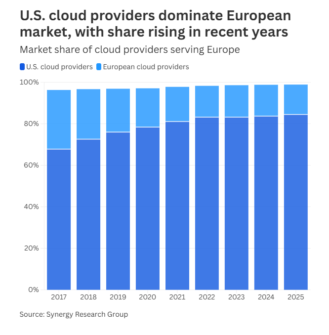 Ωστόσο, η Amazon, η Microsoft και η Google ελέγχουν περισσότερο από το 70% της αγοράς cloud στην περιοχή, ενώ οι αμερικανικές εταιρείες κατέχουν τουλάχιστον το 59% της αγοράς επιχειρηματικού λογισμικού.
