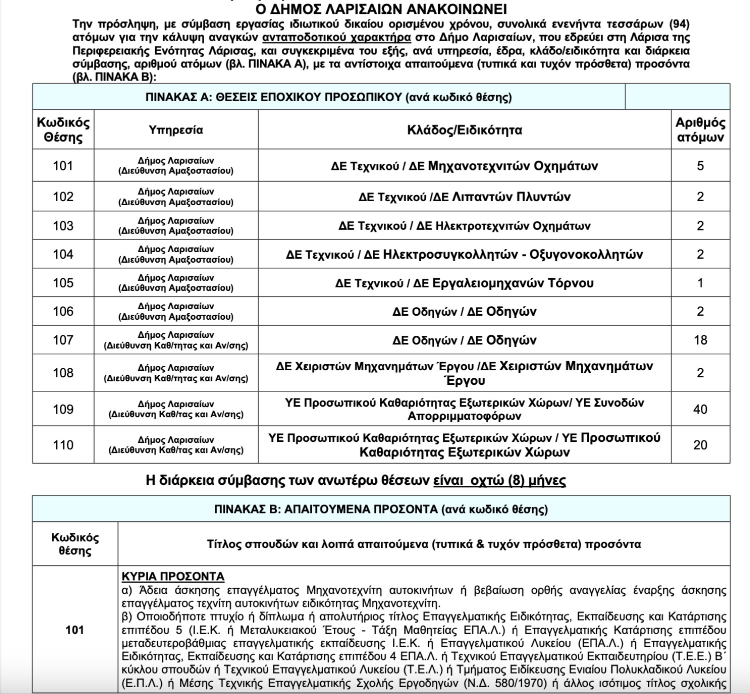 Ο Δήμος Λαρισαίων προχωρά στην πρόσληψη, με σύμβαση εργασίας ιδιωτικού δικαίου ορισμένου χρόνου, συνολικά ενενήντα τεσσάρων (94) ατόμων για την κάλυψη αναγκών ανταποδοτικού χαρακτήρα.
