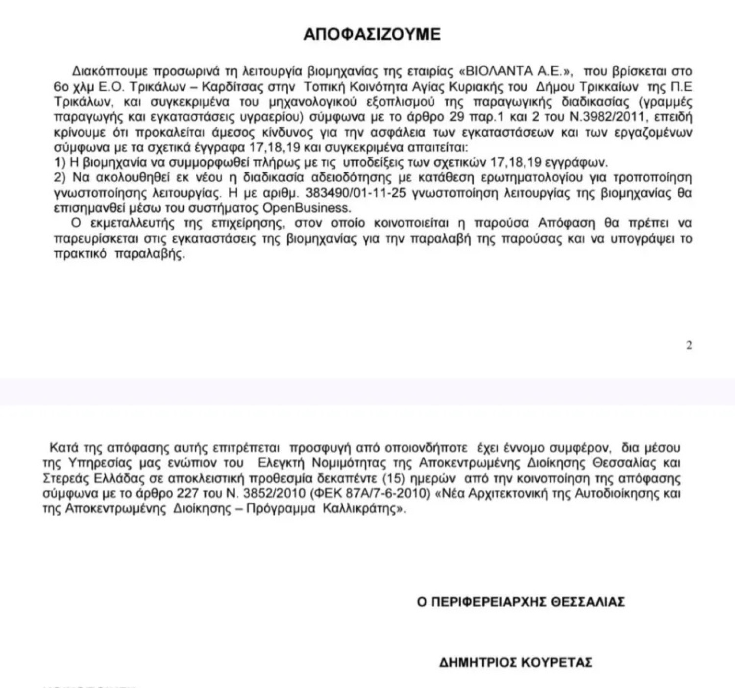 «Διακόπτουμε προσωρινά τη λειτουργία της βιομηχανίας της εταιρίας “Βιολάντα”, που βρίσκεται στο 6ο χλμ Ε.Ο Τρικάλων – Καρδίτσας στην Τοπική Κοινότητα Αγίας Κυριακής του Δήμου Τρικκαίων της Π.Ε. Τρικάλων και συγκεκριμένα του μηχανολογικού εξοπλισμού της παραγωγικής διαδικασίας (γραμμές παραγωγής και εγκαταστάσεις υγραερίου) σύμφωνα με το άρθρο 29 παρ. 1 και 2 του Ν. 3982/2011 επειδή κρίνουμε ότι προκαλείται άμεσος κίνδυνος για την ασφάλεια των εγκαταστάσεων και τον εργαζομένων σύμφωνα με τα σχετικά έγγραφα 17, 18, 19 και συγκεκριμένα απαιτείται: